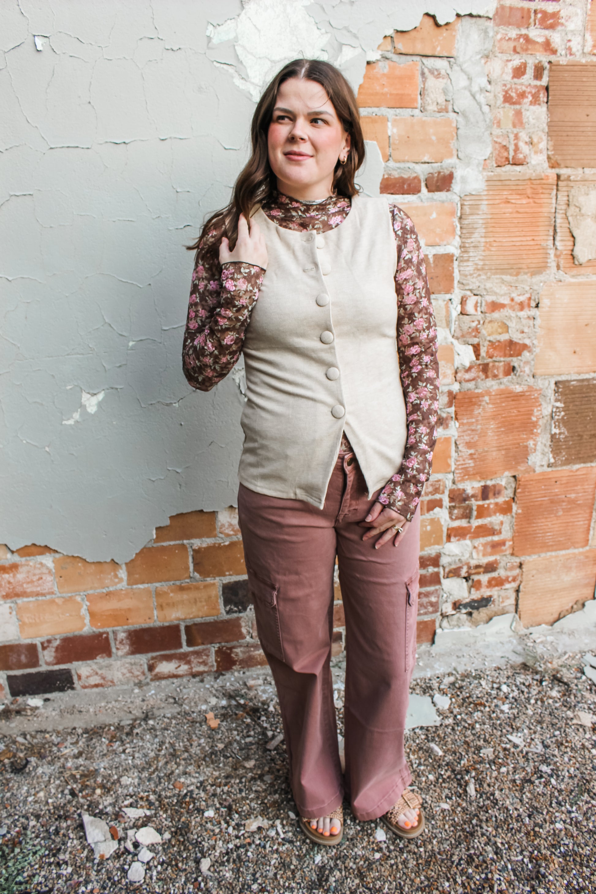 The trendiest vest with functional buttons down the front & endless ways to style! Wear it open or buttoned up over so many different tops. The softest material, a great neutral color & perfect for any season of the year! Fits true to size.