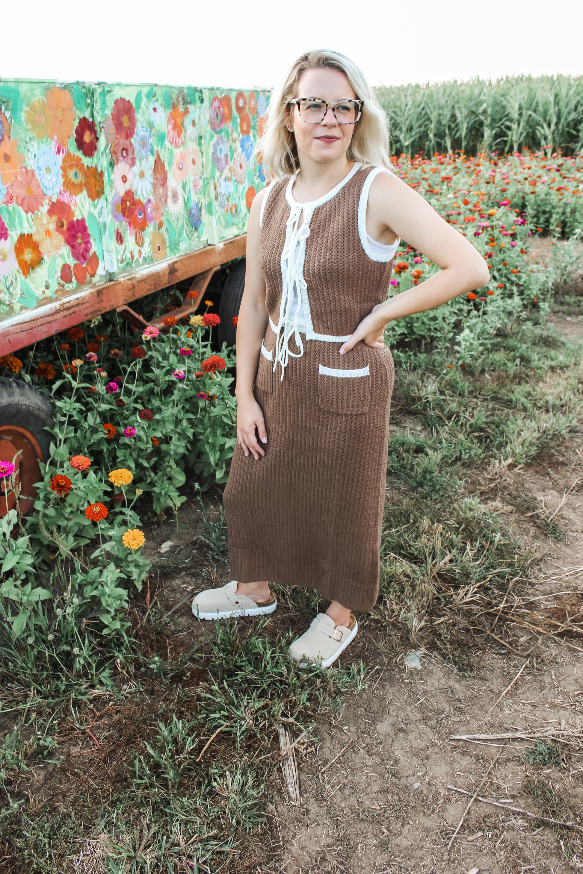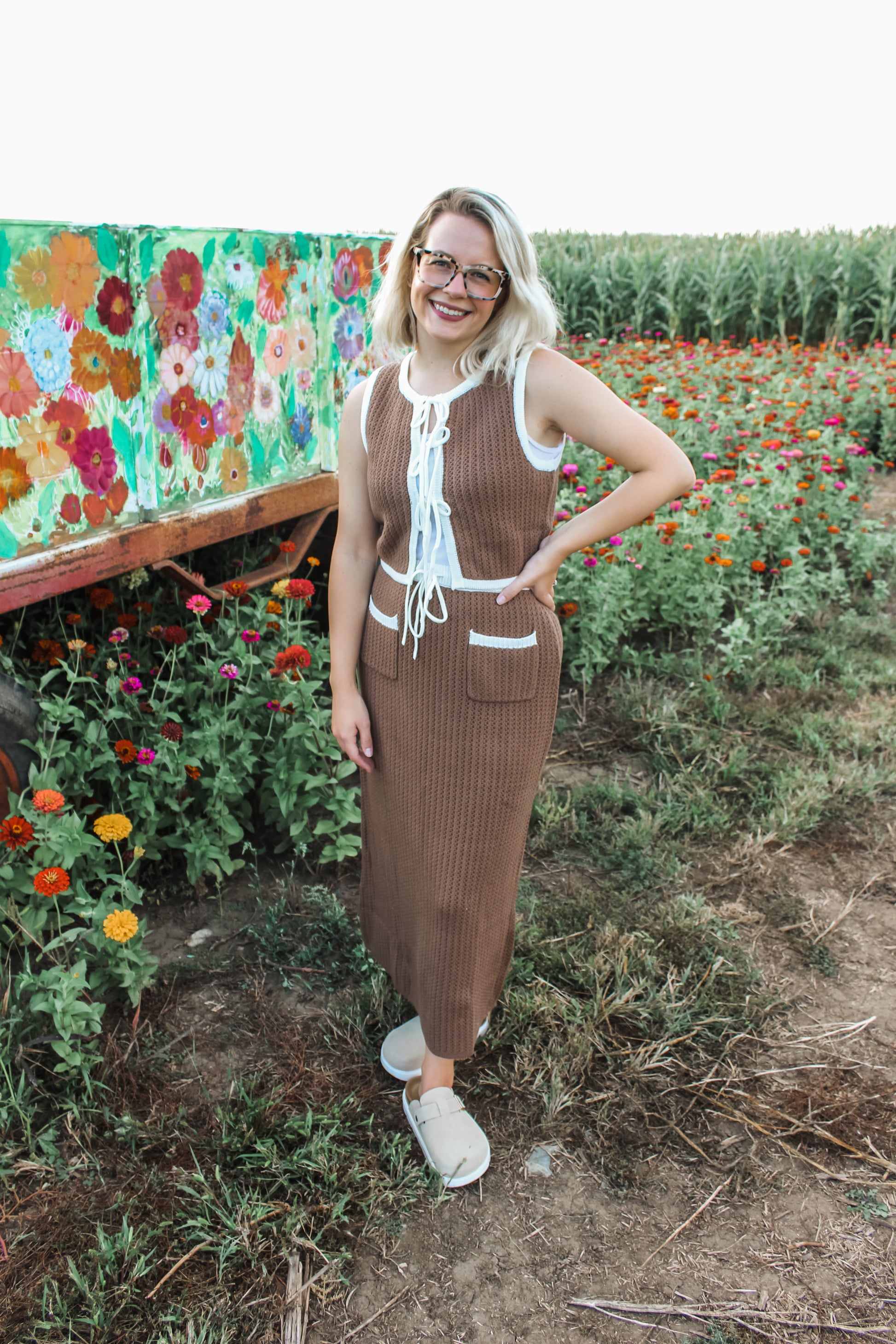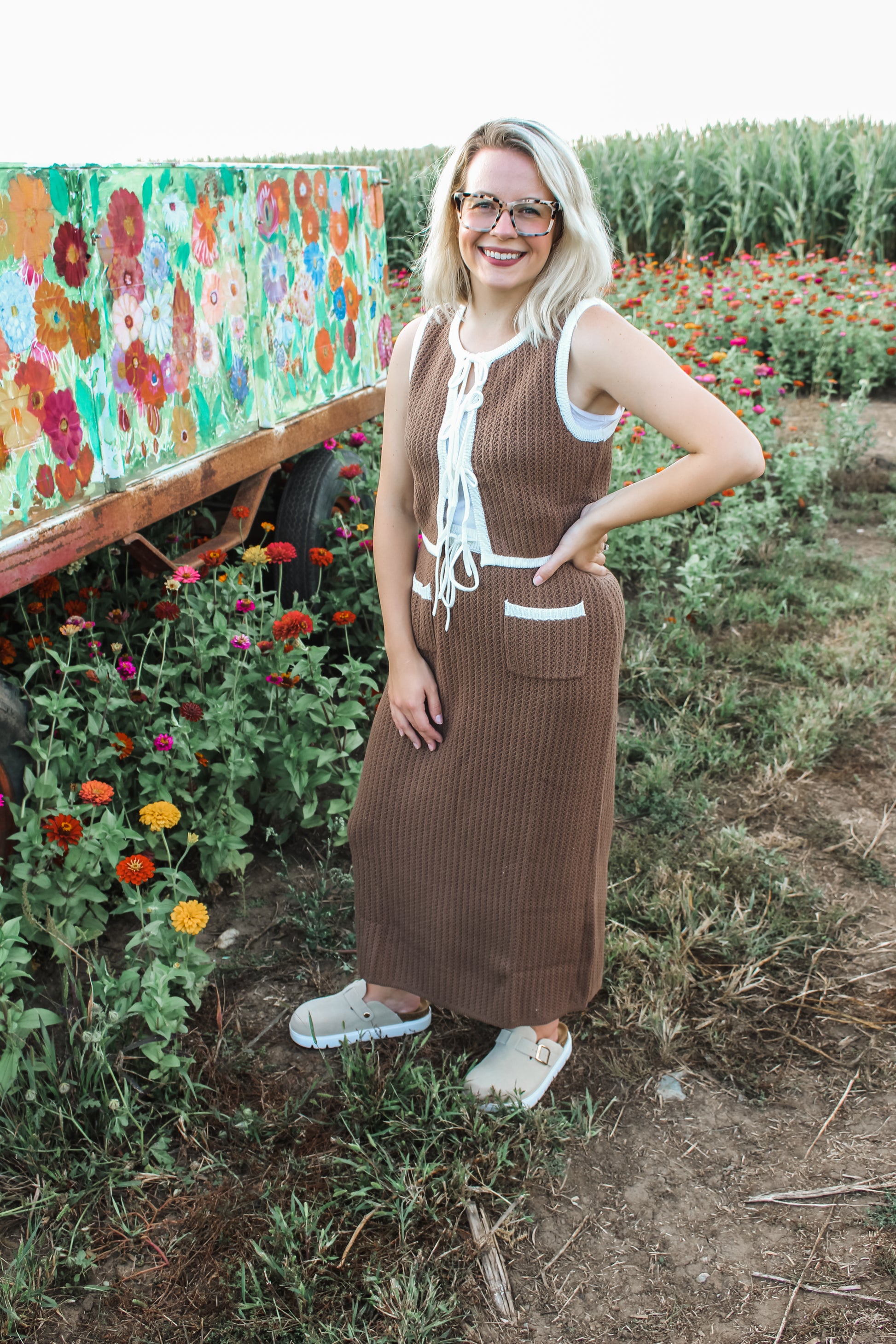 This set is sold together & so adorable! Featuring a tie front vest top and the knit textured material is just too cute & comfortable too. The skirt features an elastic waistband with front pockets and a functional drawstring. Fits true to size.