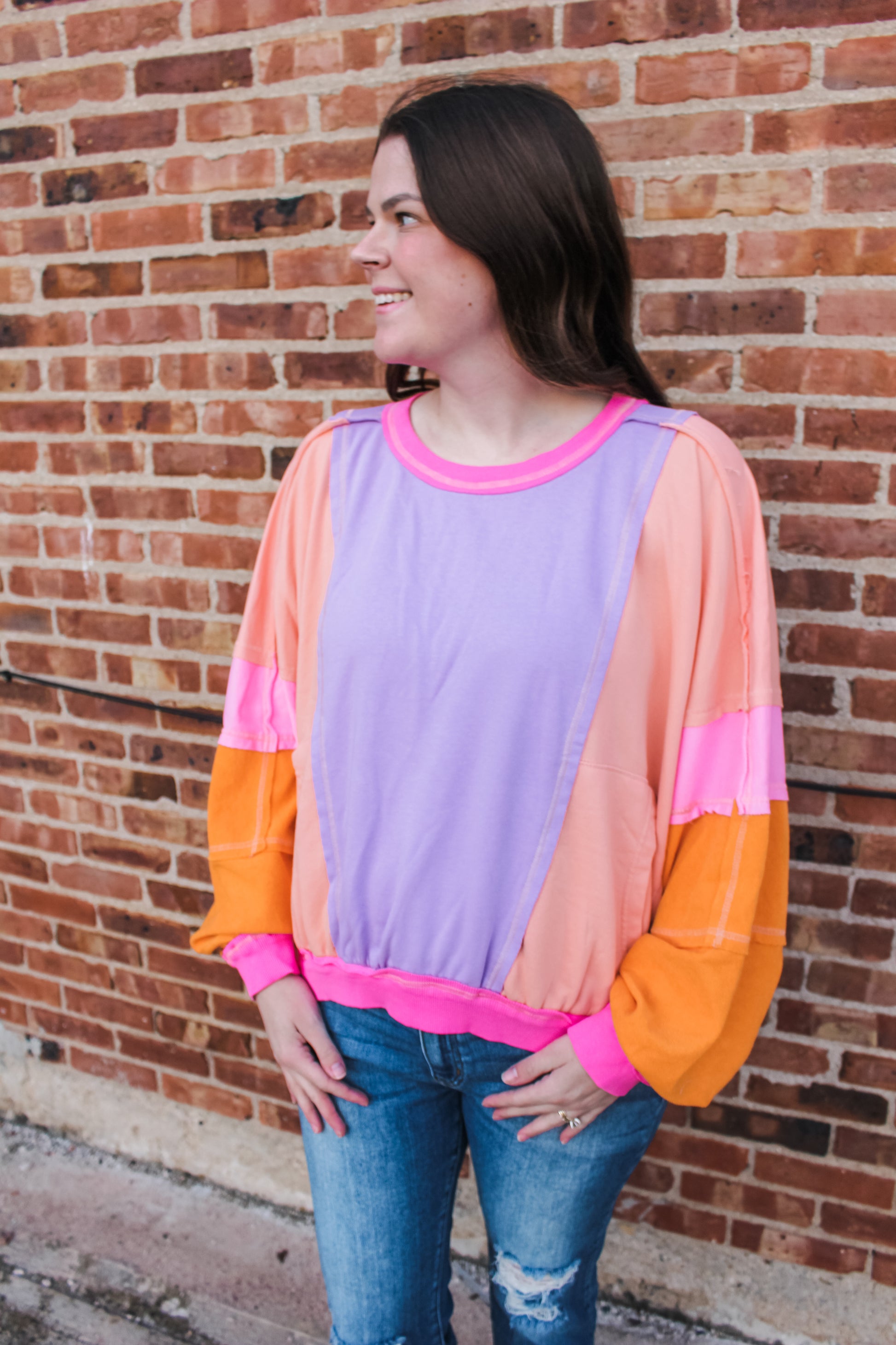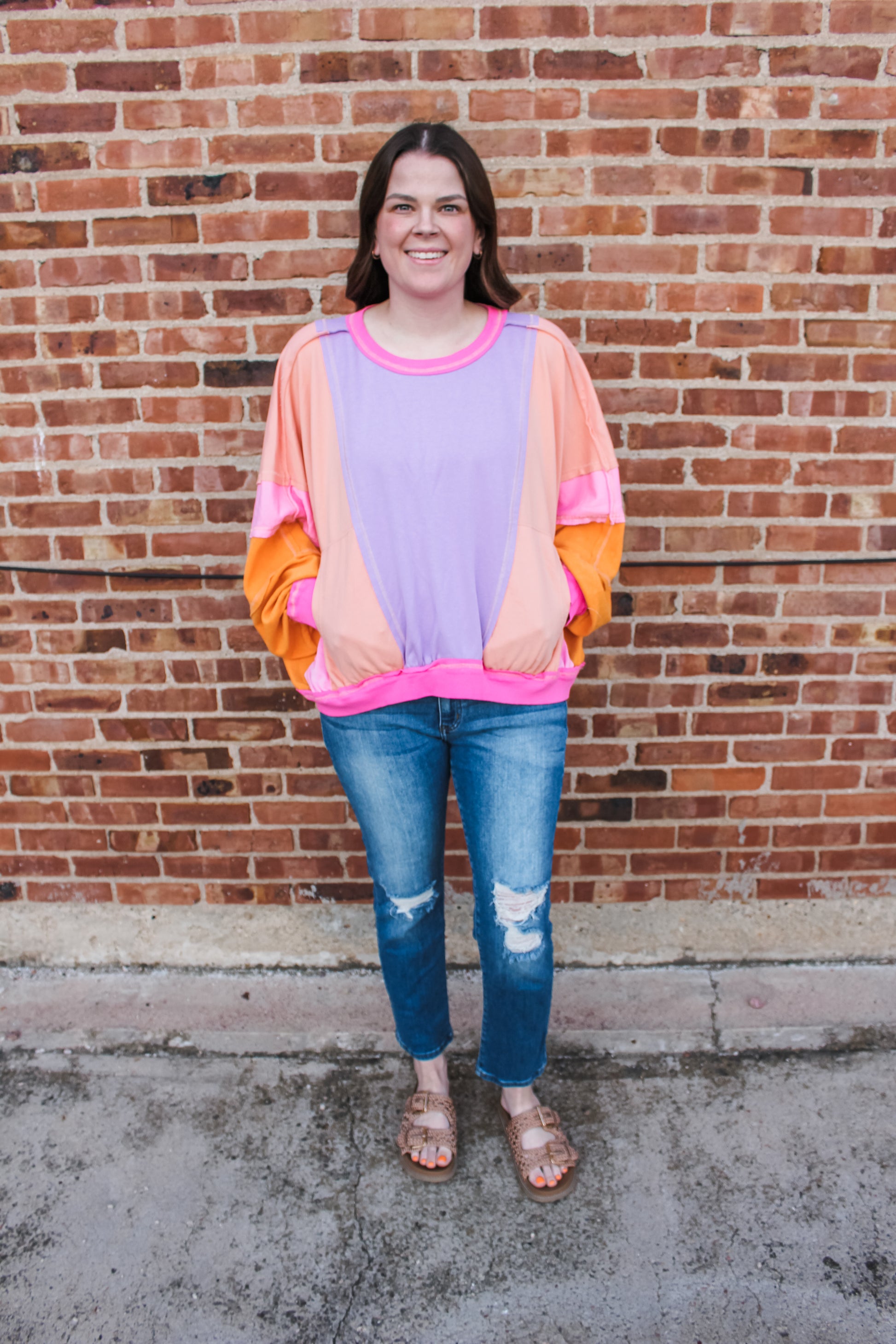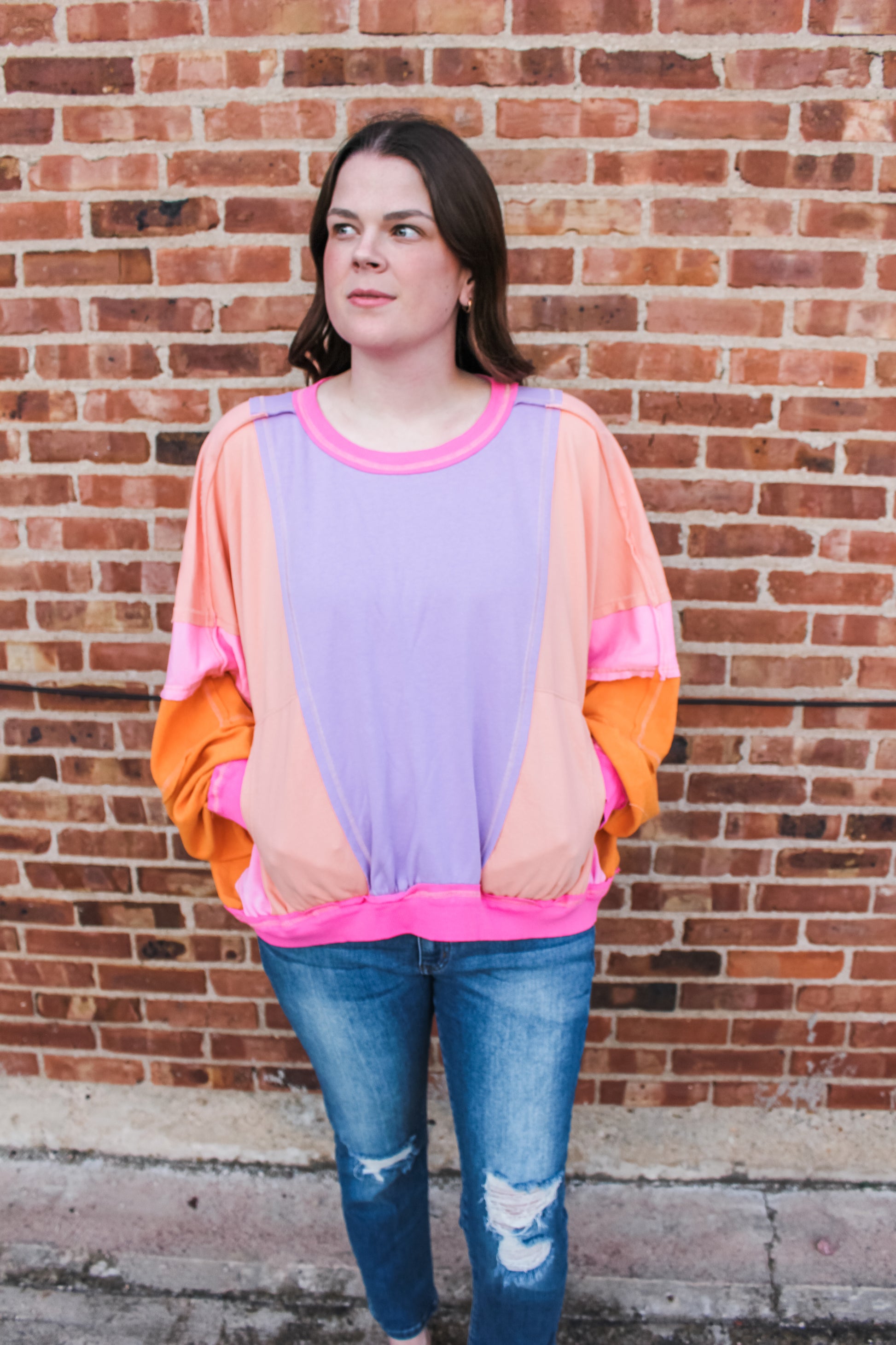 The coziest crewneck featuring bright & bold colors, front pockets, and an oversized fit! Model is pictured wearing her true size medium.