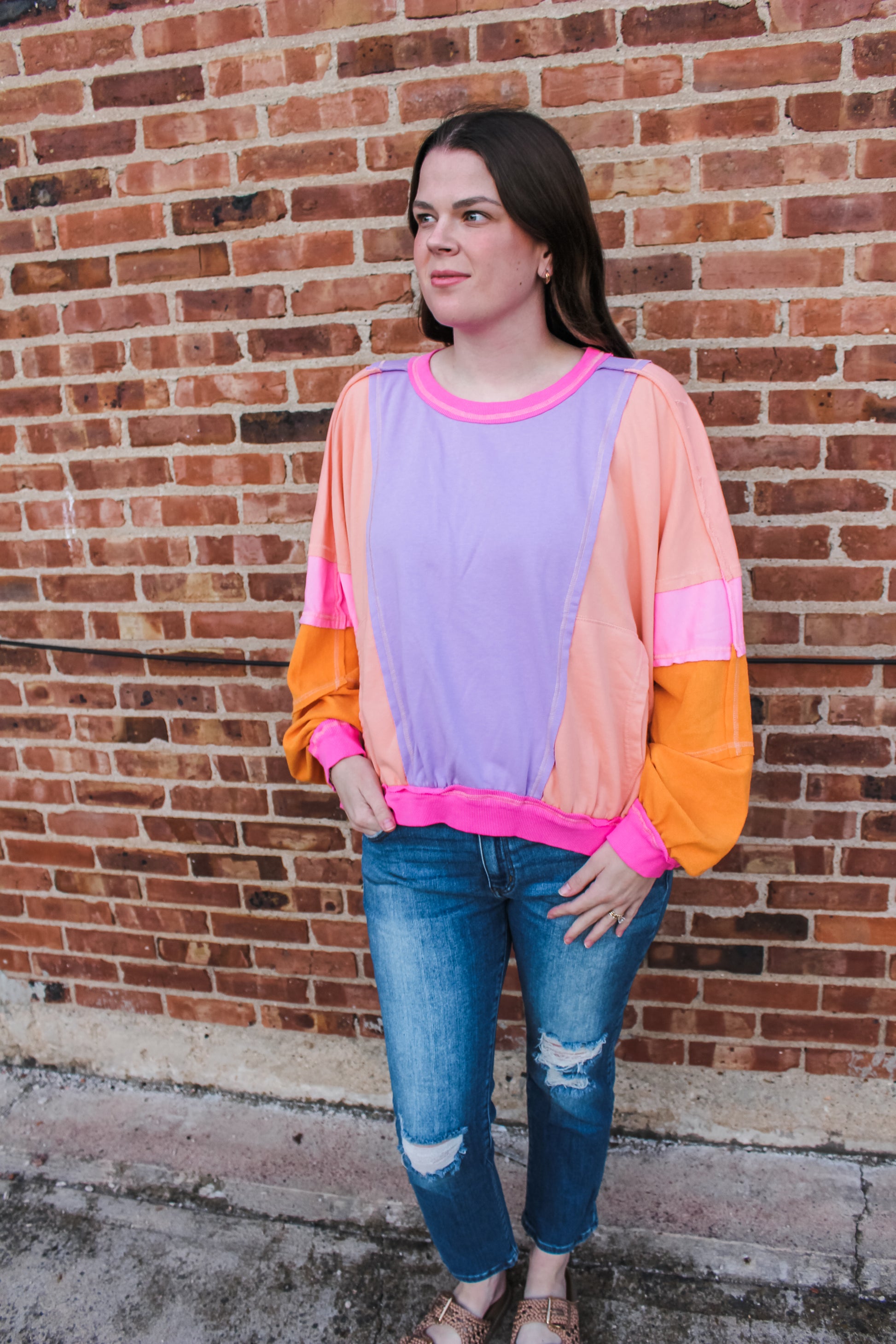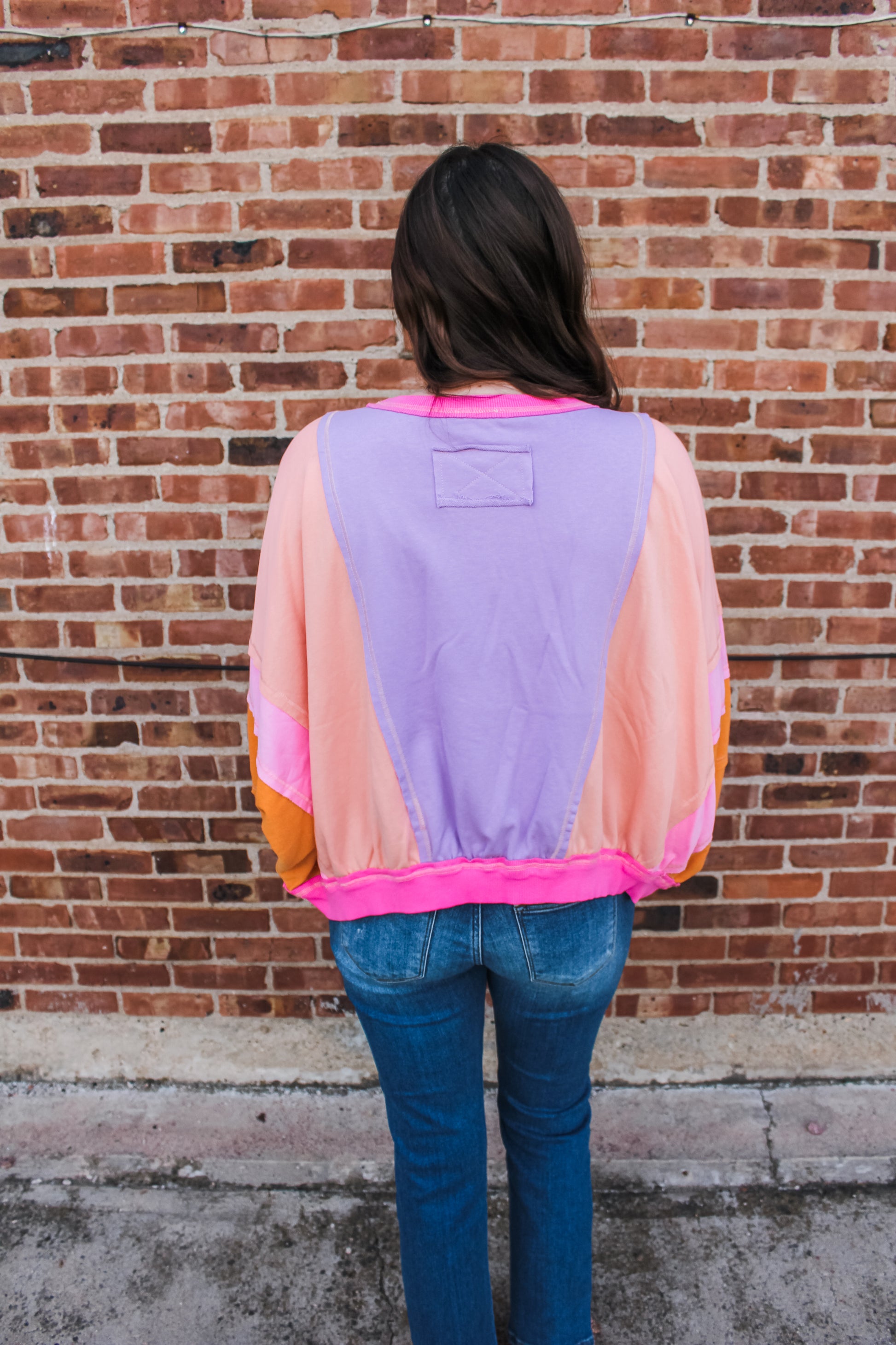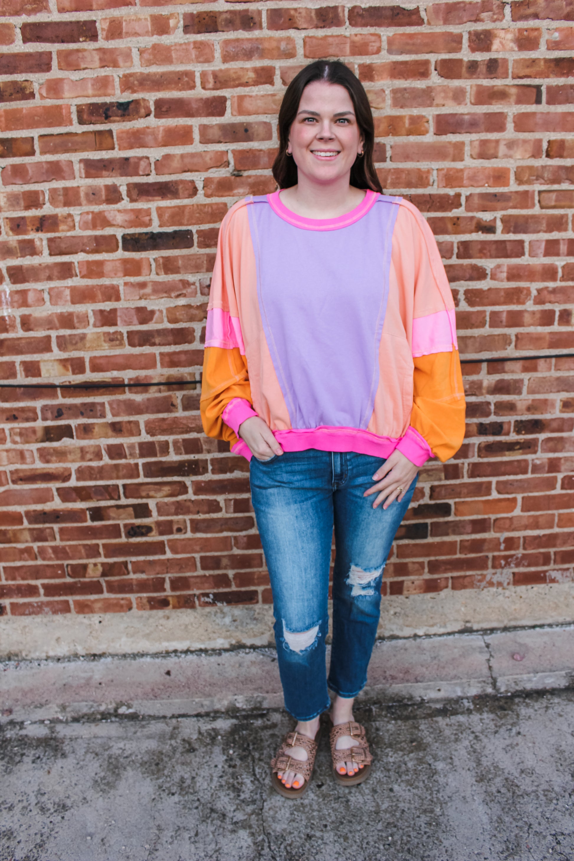The coziest crewneck featuring bright & bold colors, front pockets, and an oversized fit! Model is pictured wearing her true size medium.