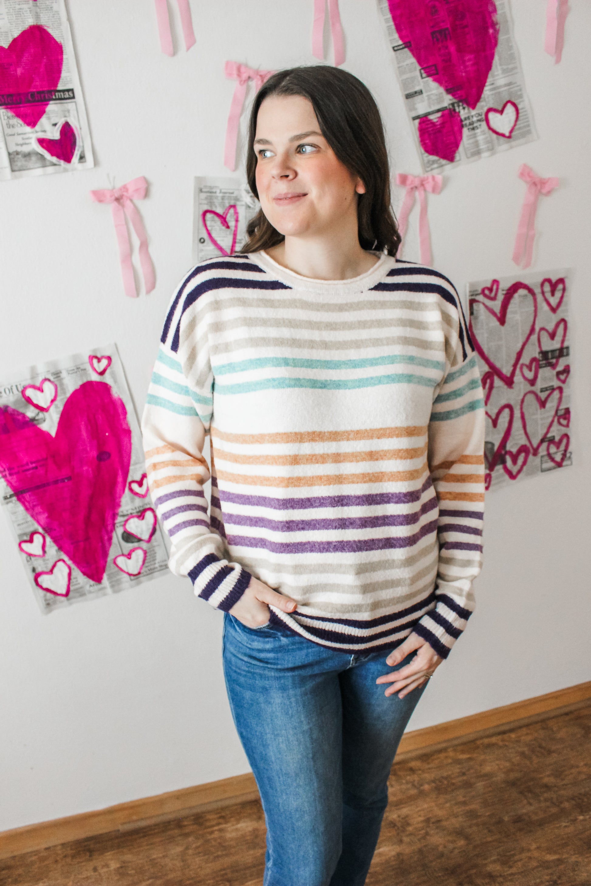 Stripes never go out of style! We love the fun color scheme & how cute & cozy this sweater is! A closet staple but make it fun! Fits true to size.