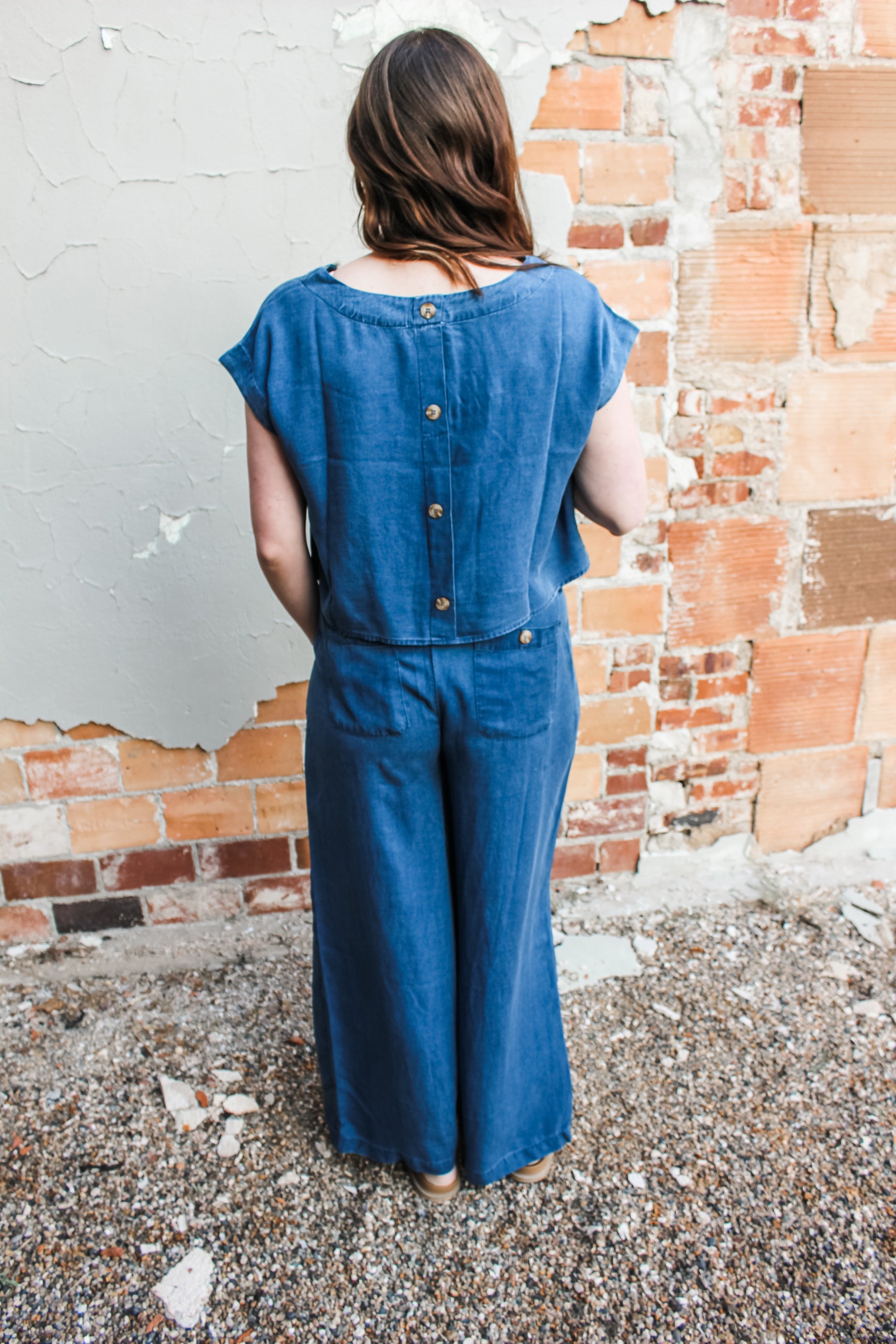 This slightly cropped top is so cute paired with the matching jeans but also so cute paired with color denim or a skirt for fall. Featuring a rounded neckline with the cutest button details on the back. We love the lightweight & multiple ways to style this top! Fits true to size.