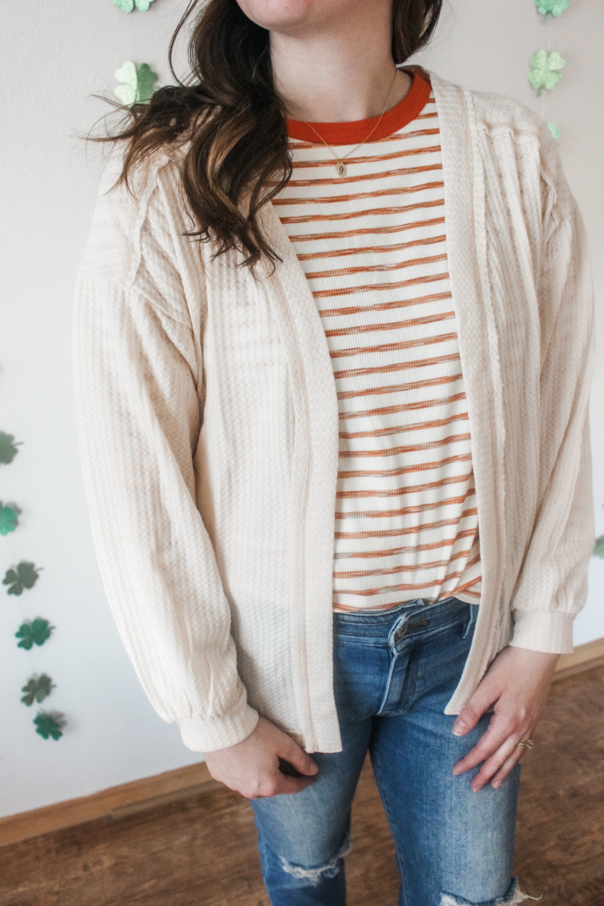 A simple versatile waffle knit cardigan - sure to be your new favorite! Featuring an open front, stitching details on the hemlines, and stich details on the back. Fits true to size.