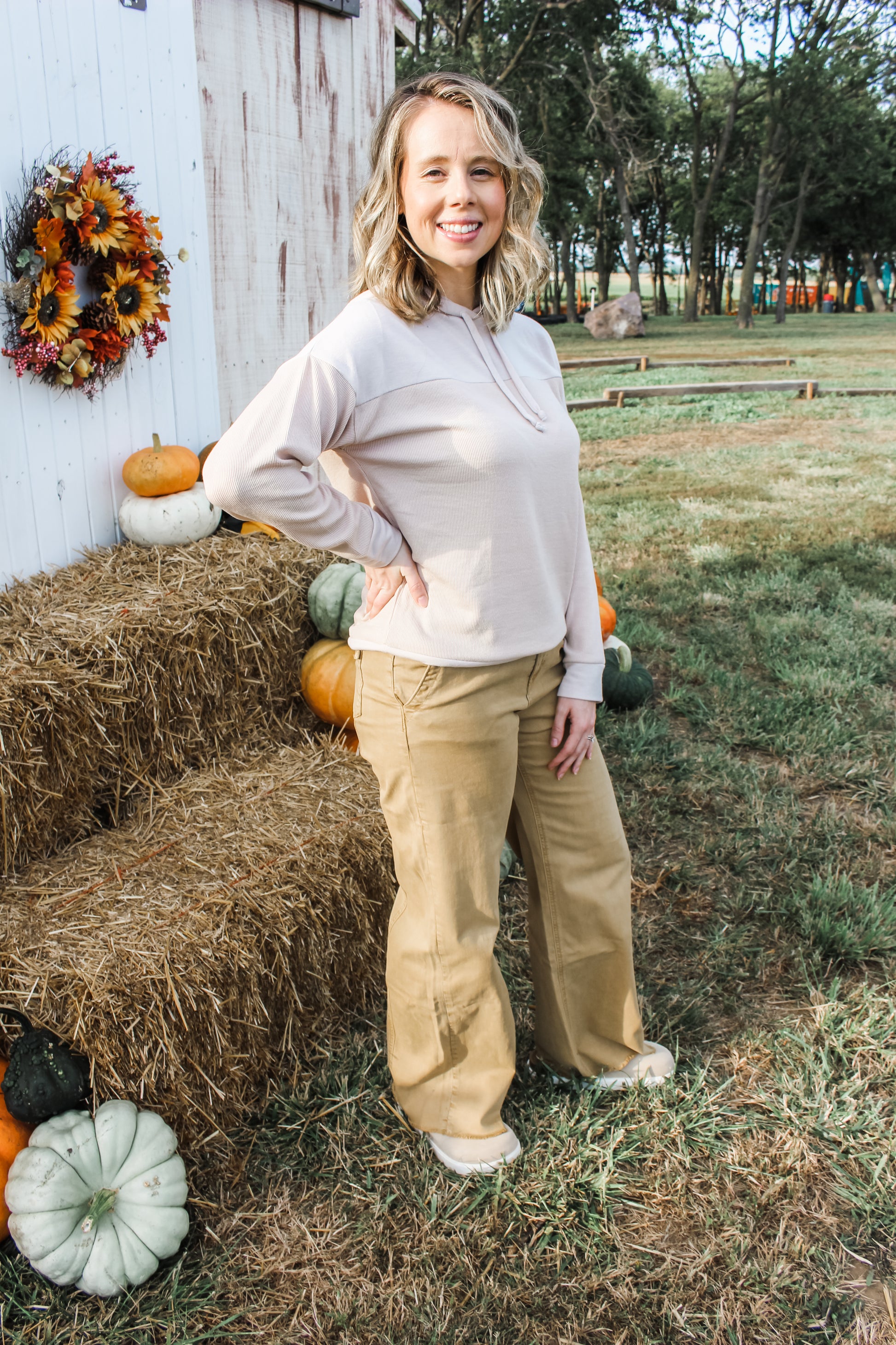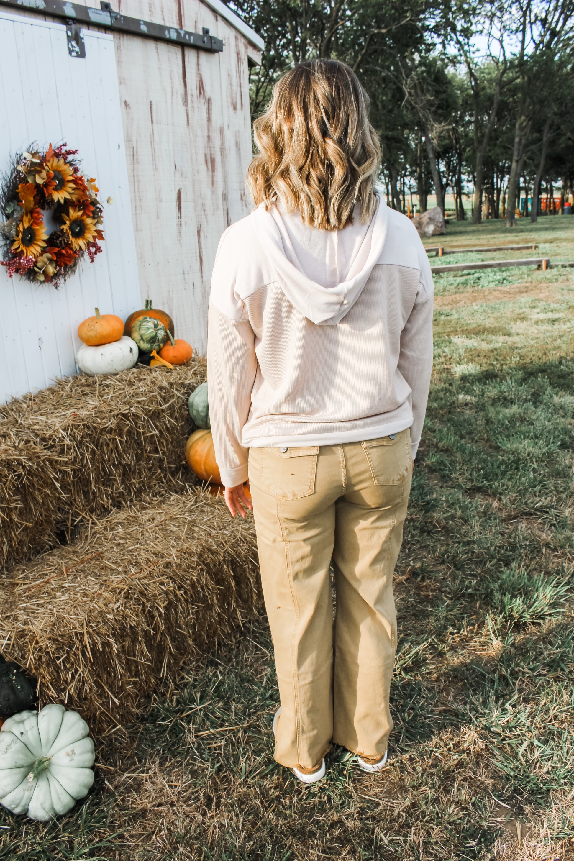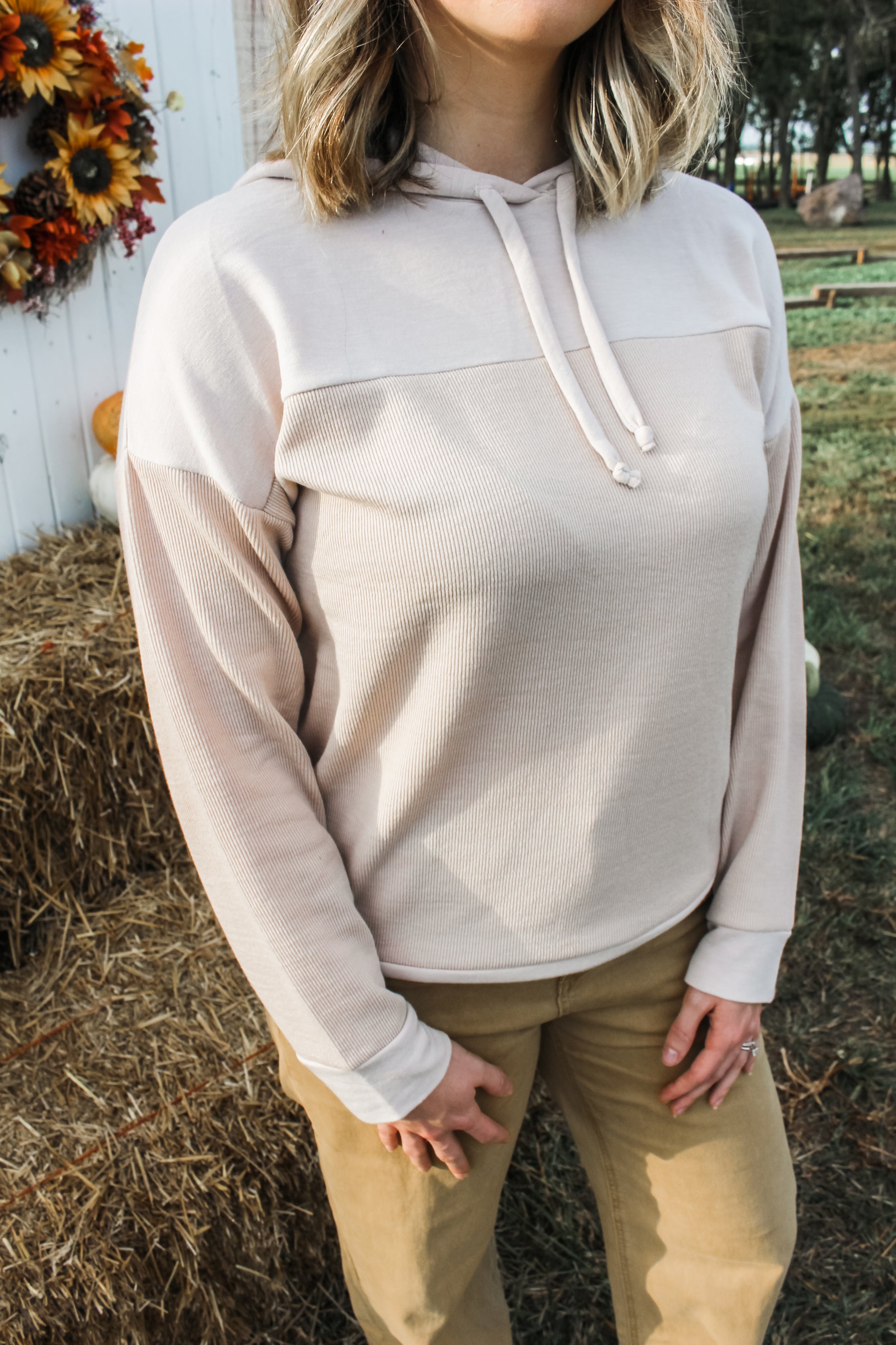 A classic hoodie with the ribbed material detail, hood with functional drawstrings, and the perfect neutral color. So easy to style! Fits true to size.