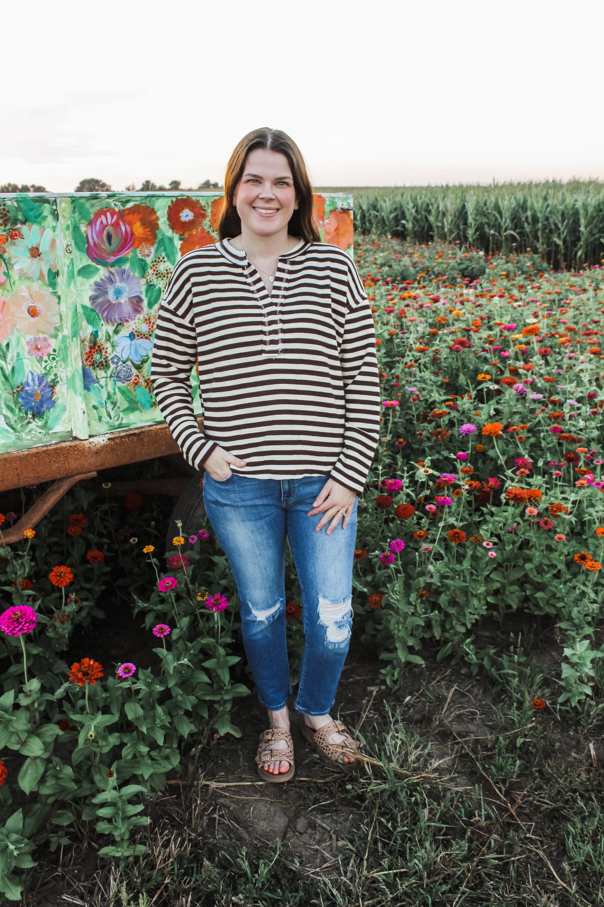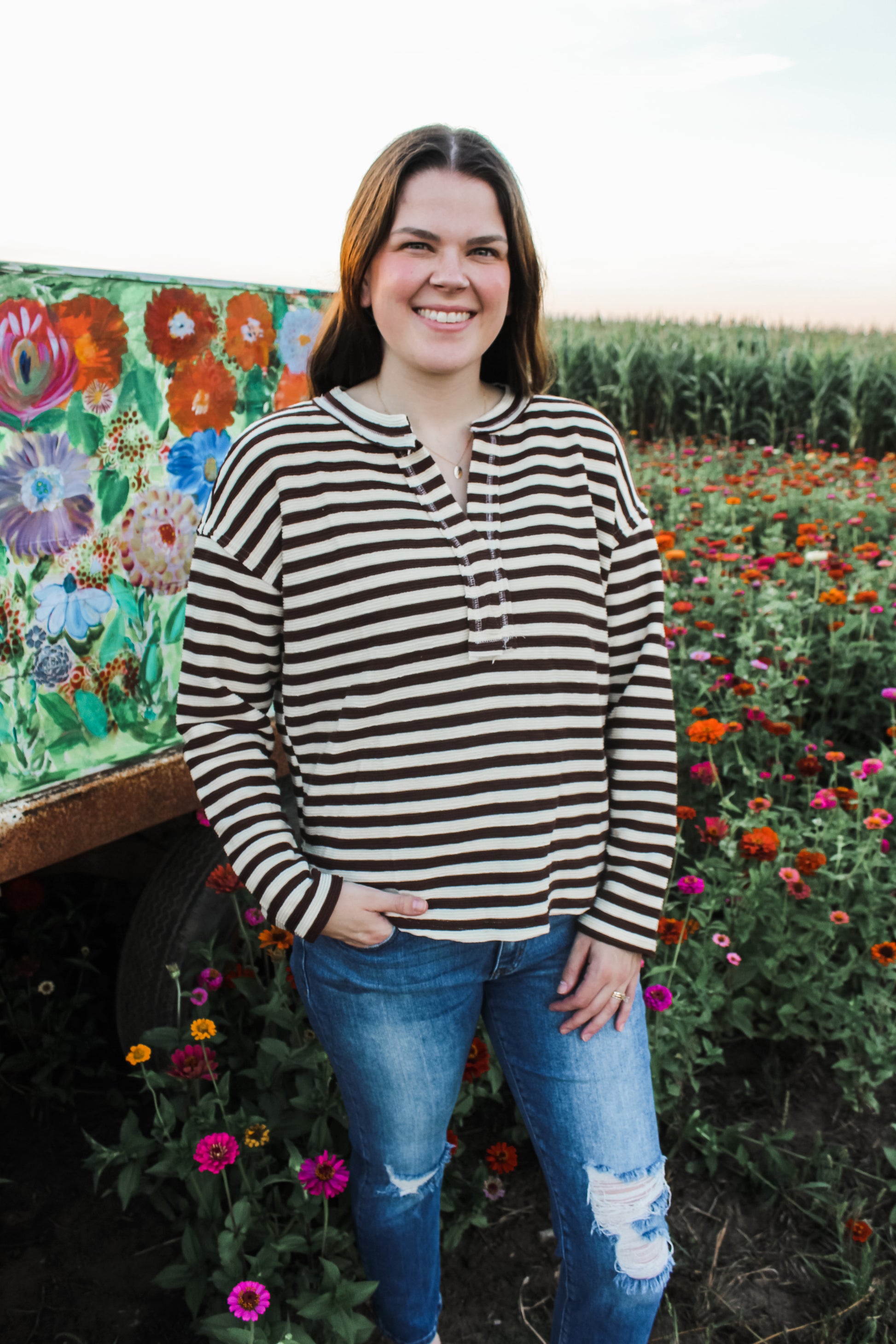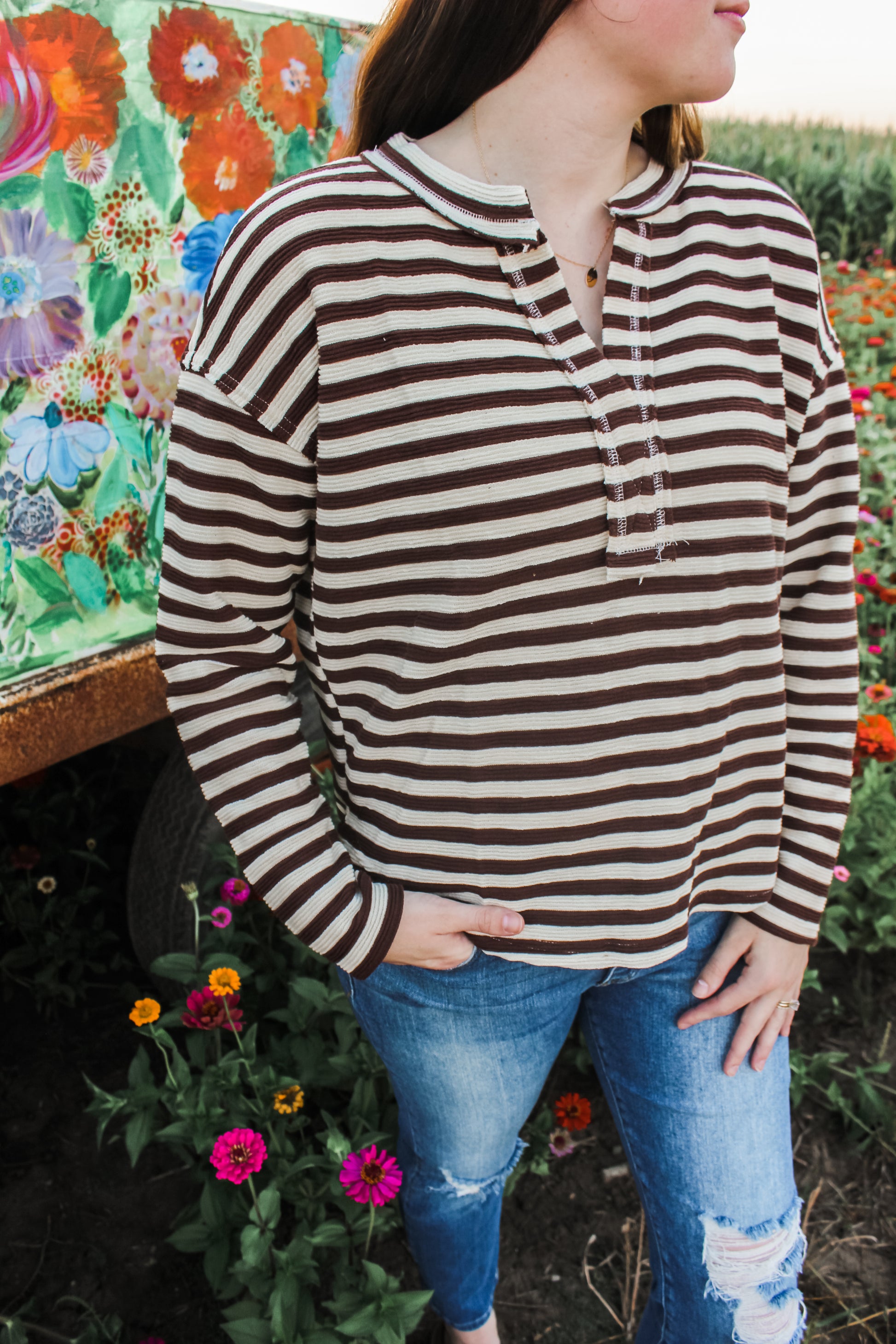 The perfect casual top! Featuring a v-neck, the cutest color combo, and a classic stripe pattern. Fits true to size.