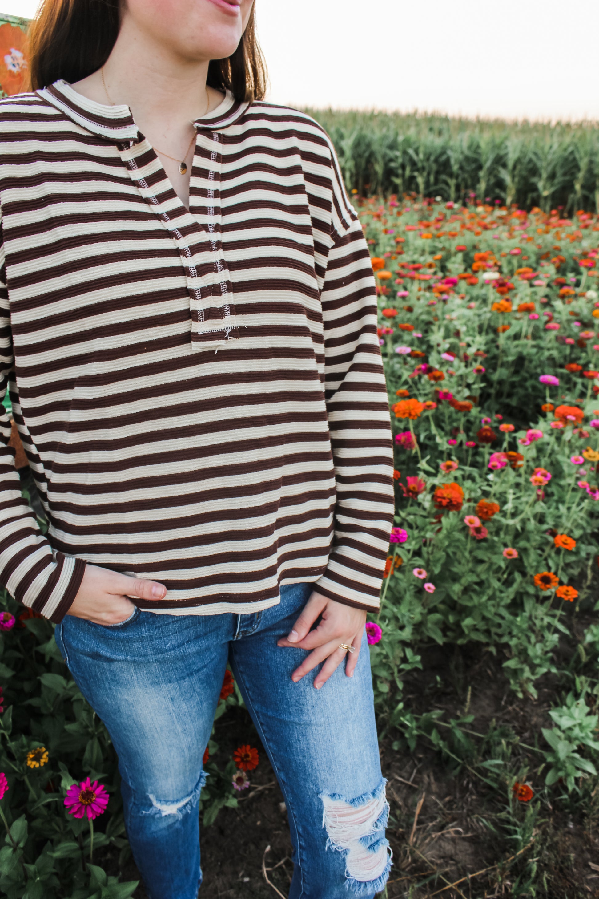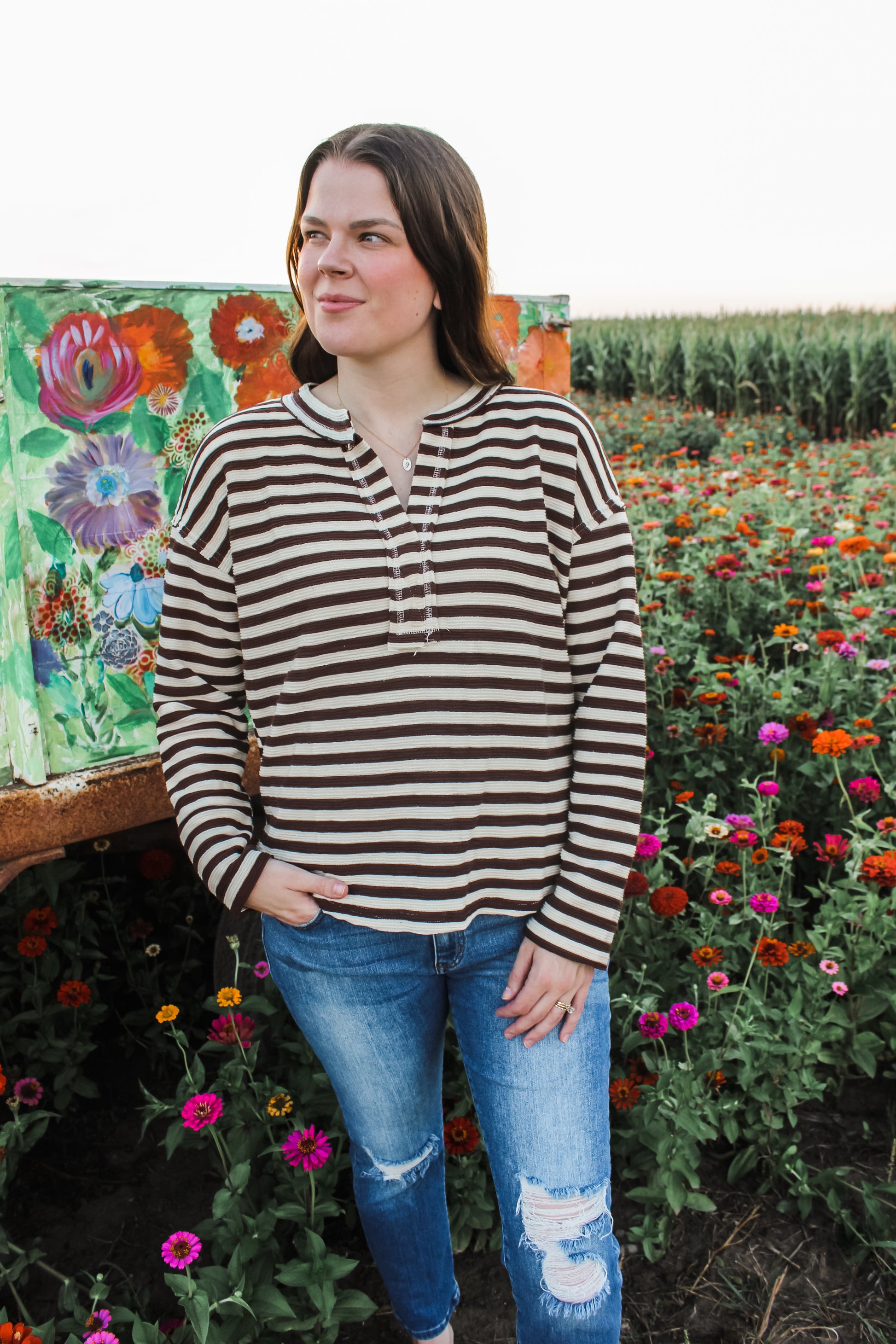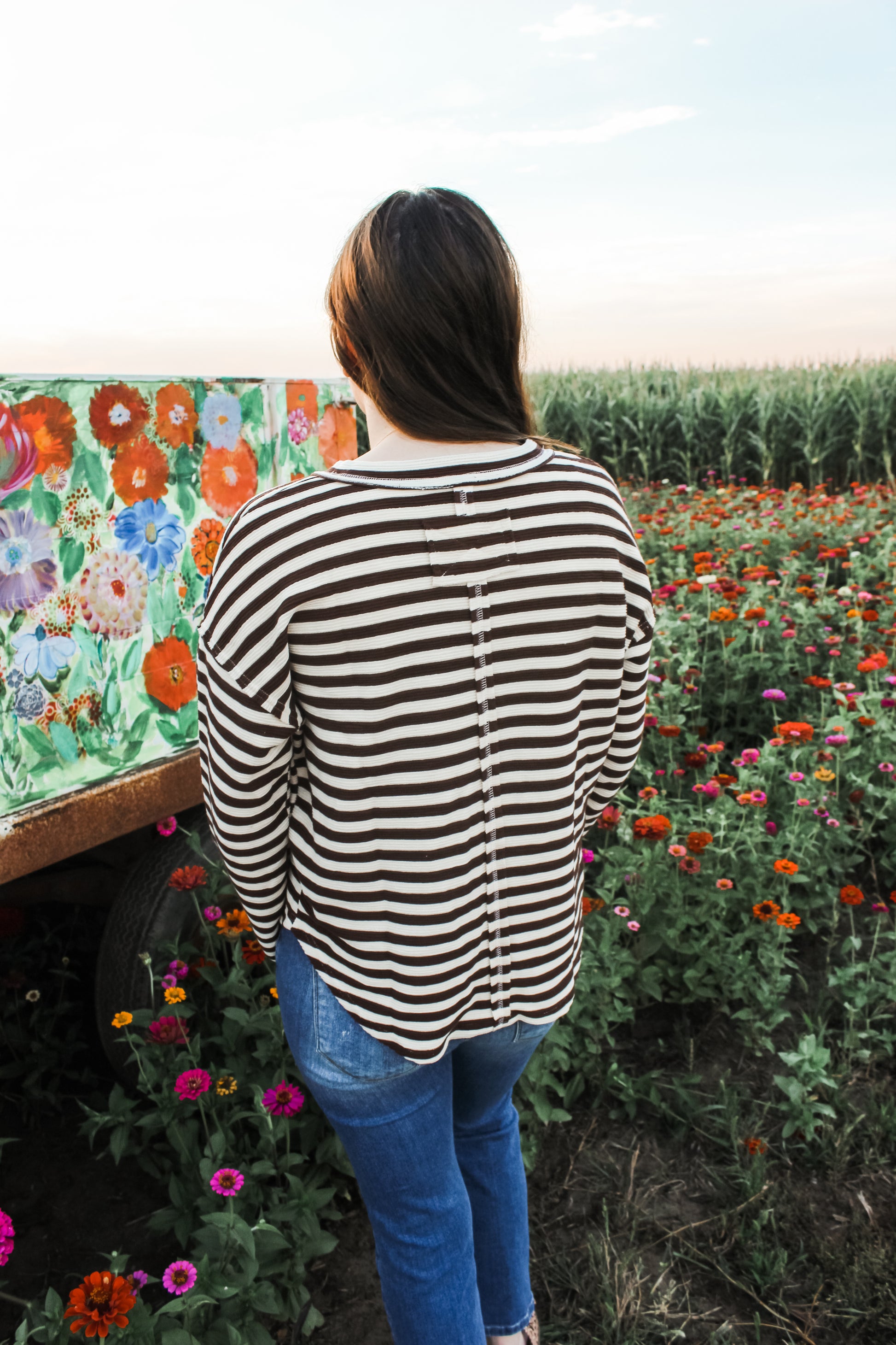 The perfect casual top! Featuring a v-neck, the cutest color combo, and a classic stripe pattern. Fits true to size.