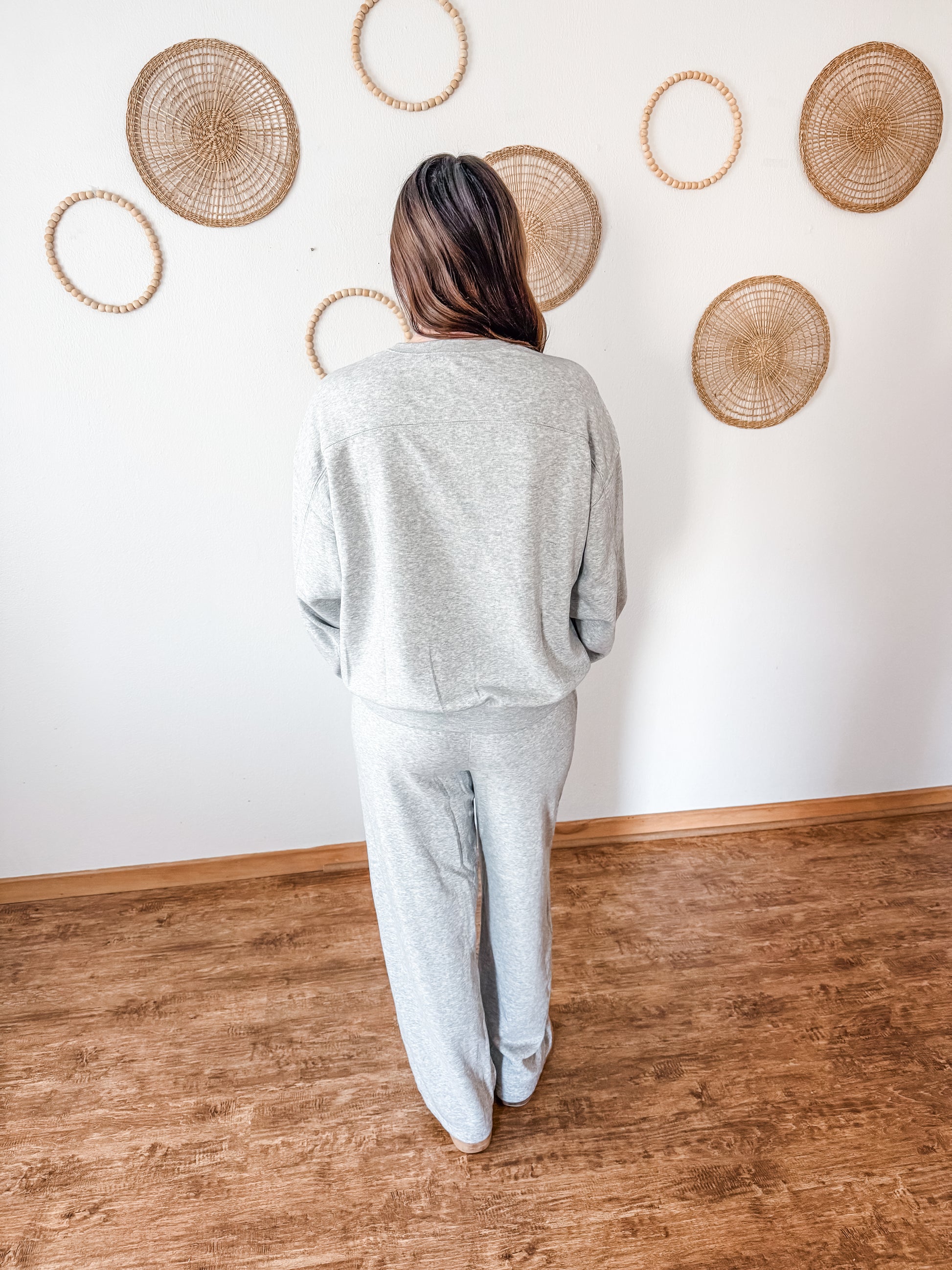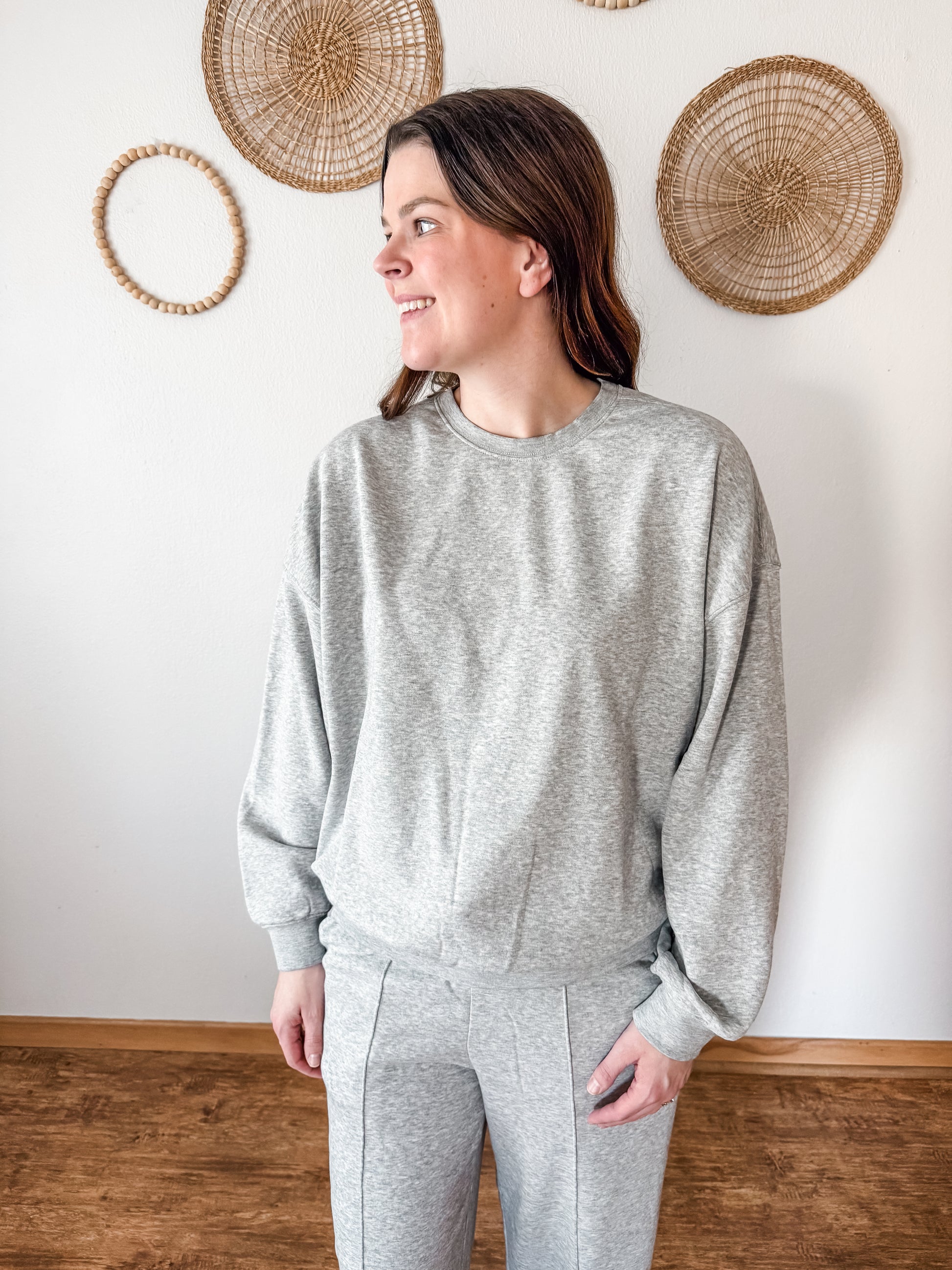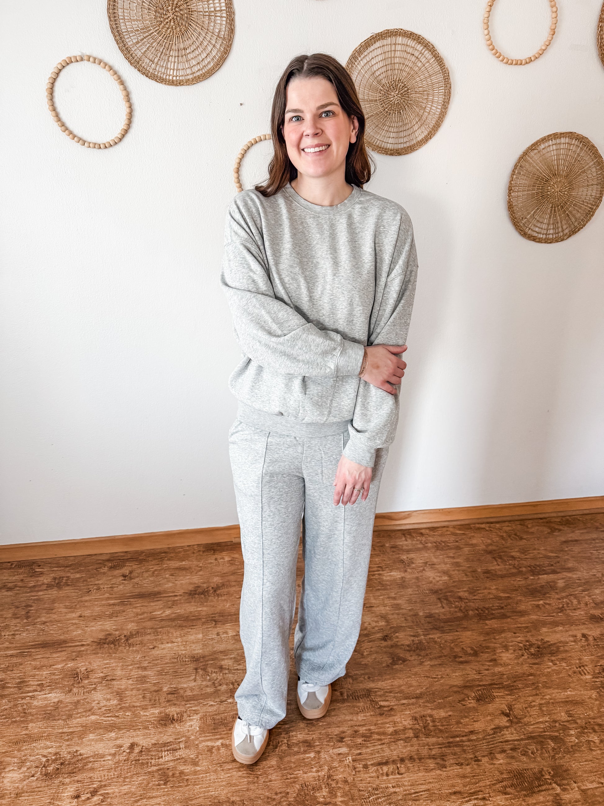 We love a good set around here & this one is amazing! Featuring a cozy crewneck and matching pants. The pants feature the cutest stitching detail down the front legs, side pockets, elastic waistband with drawstring, wide leg, and the coziest fit.