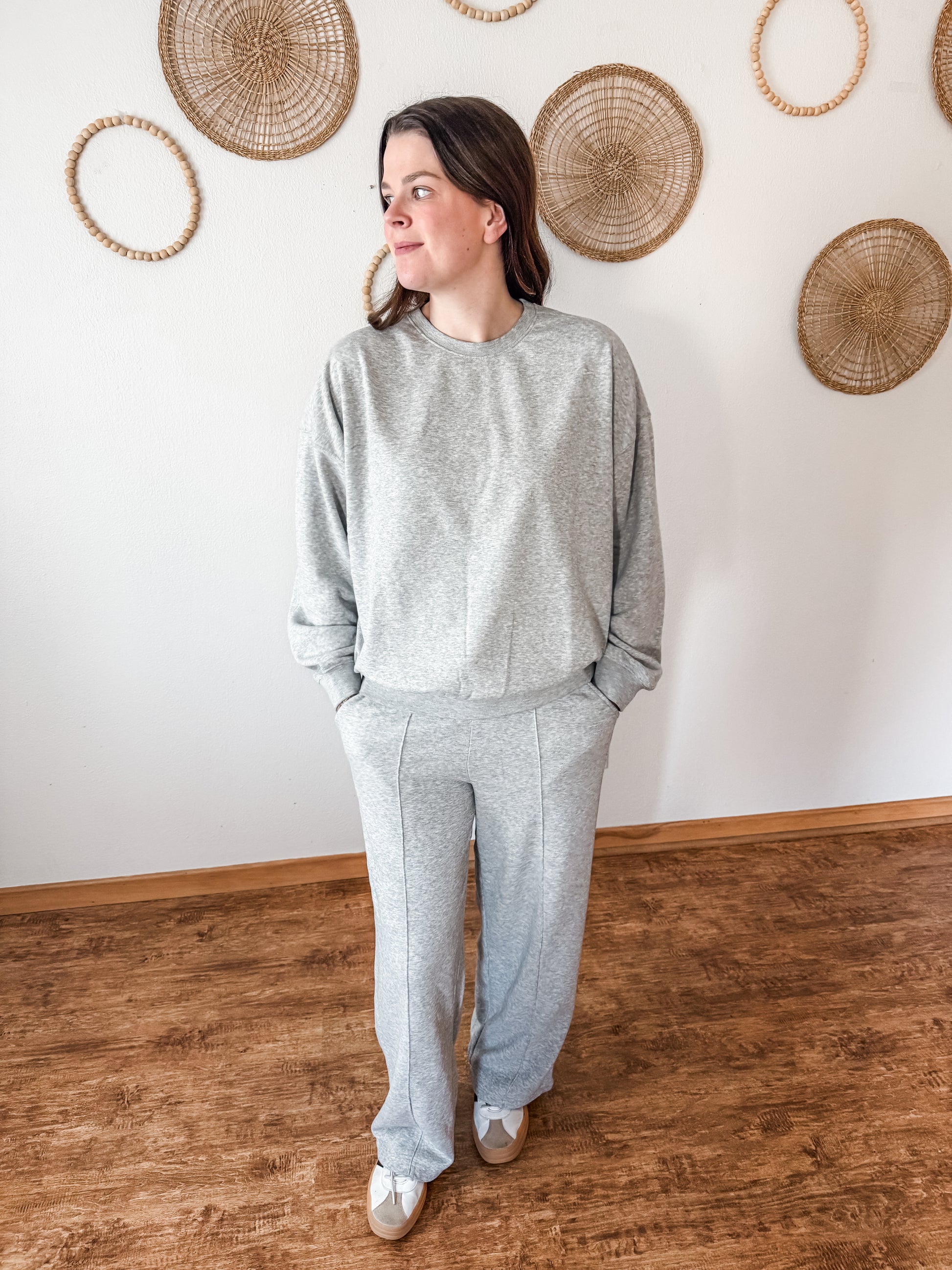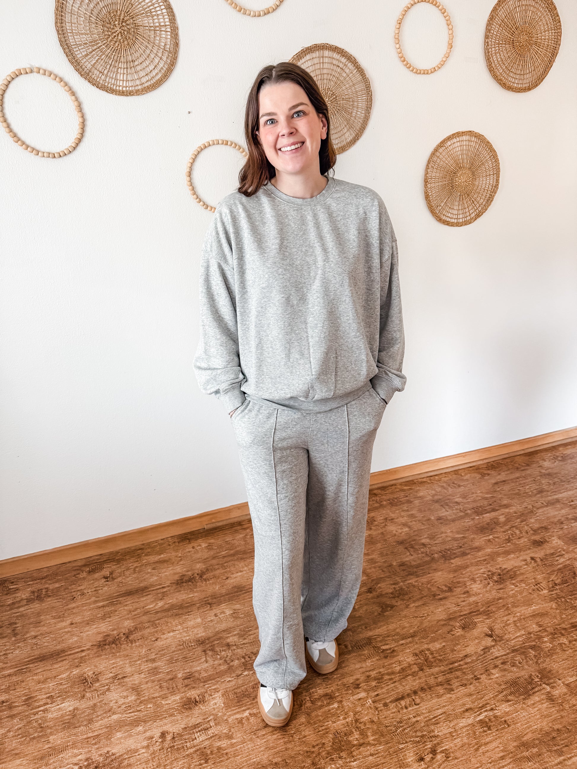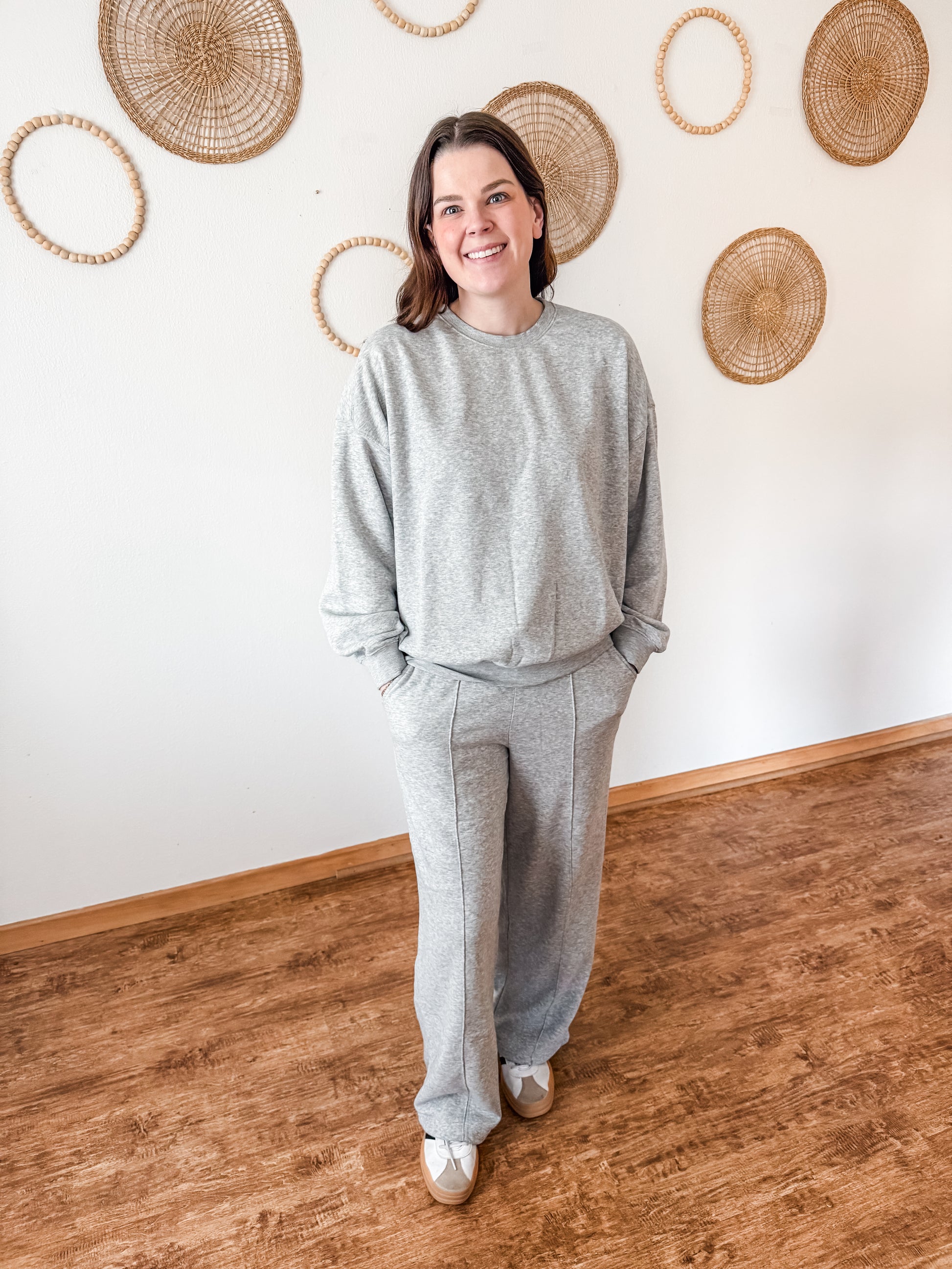 We love a good set around here & this one is amazing! Featuring a cozy crewneck and matching pants. The pants feature the cutest stitching detail down the front legs, side pockets, elastic waistband with drawstring, wide leg, and the coziest fit.