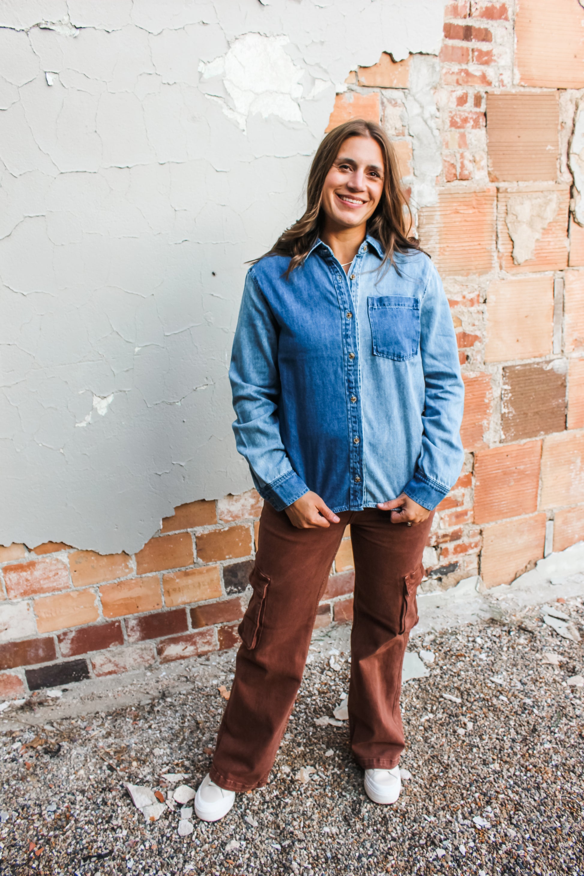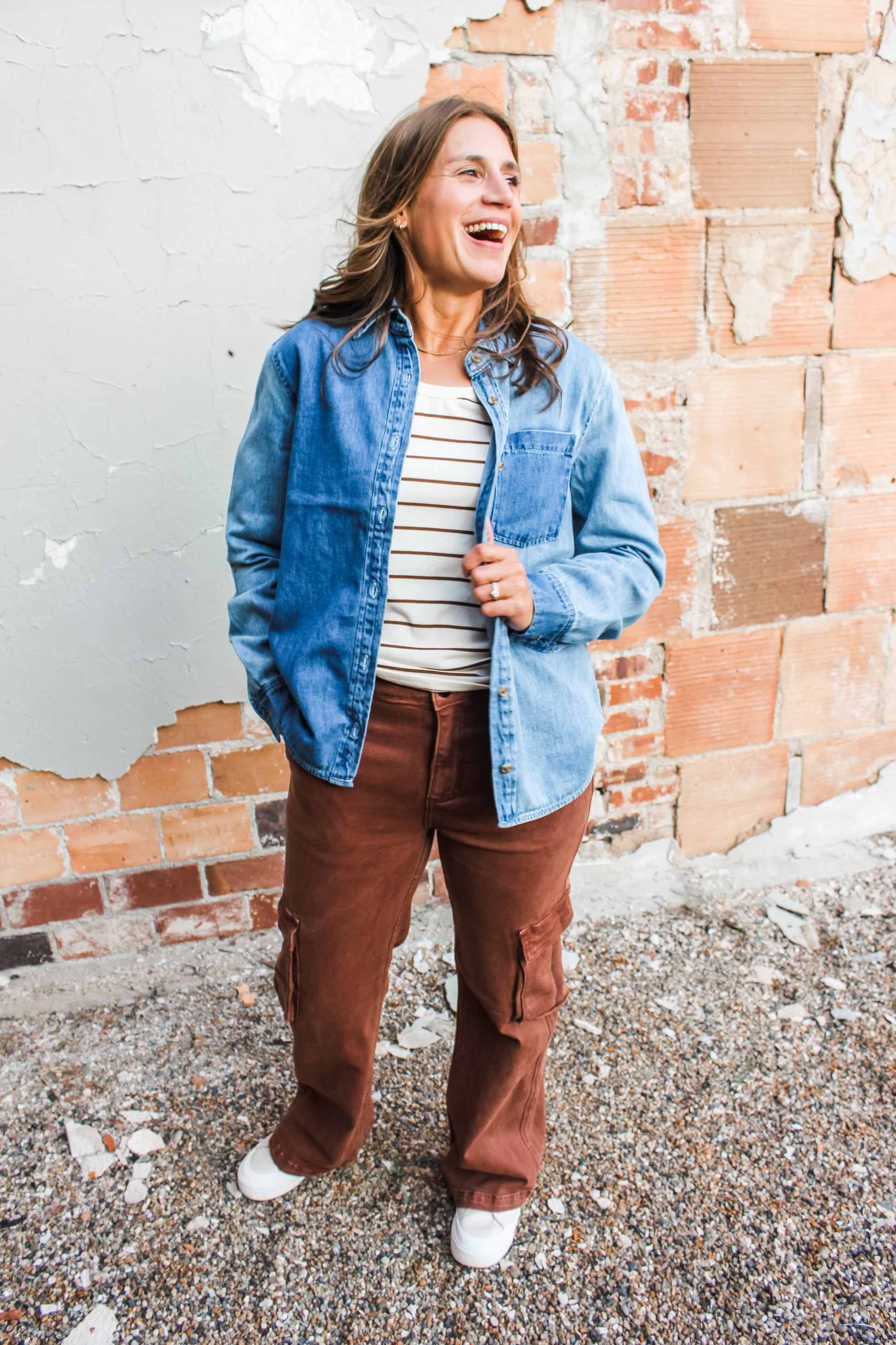 The light and dark denim color combo is so cute! This top is Thread & Supply so you know the quality is unmatched & fit is so comfortable! The ways to style this are endless & we love that. Fits true to size.