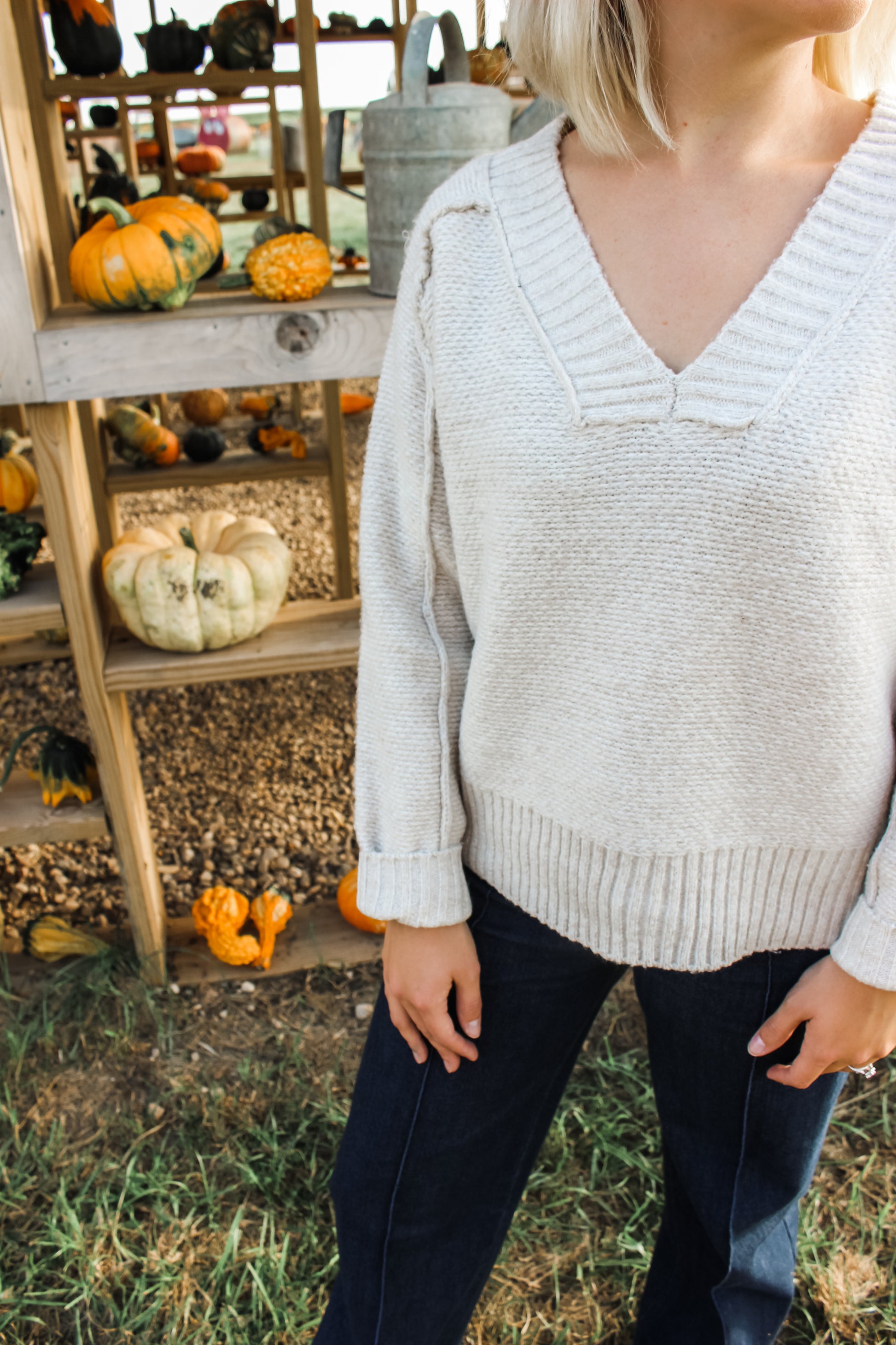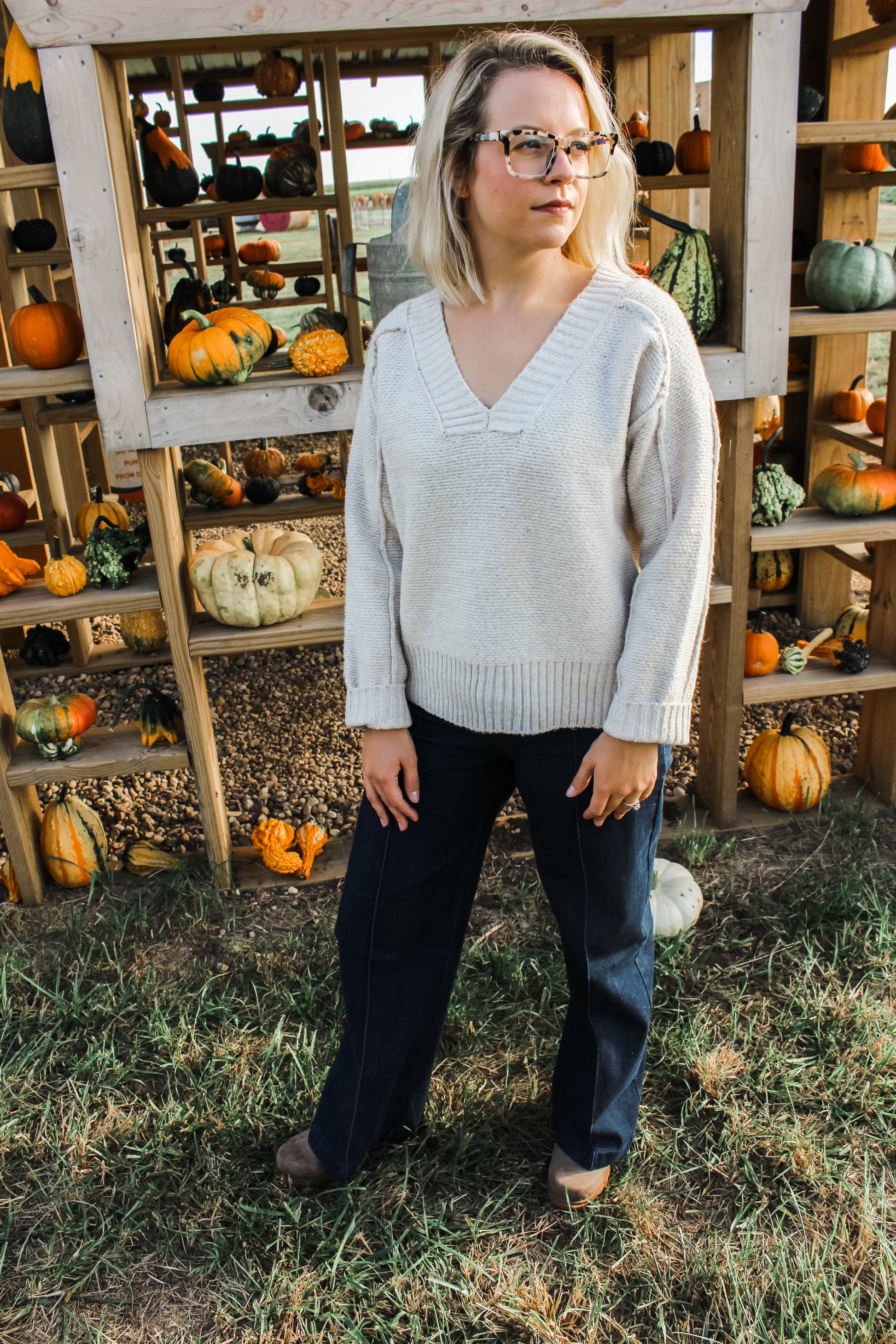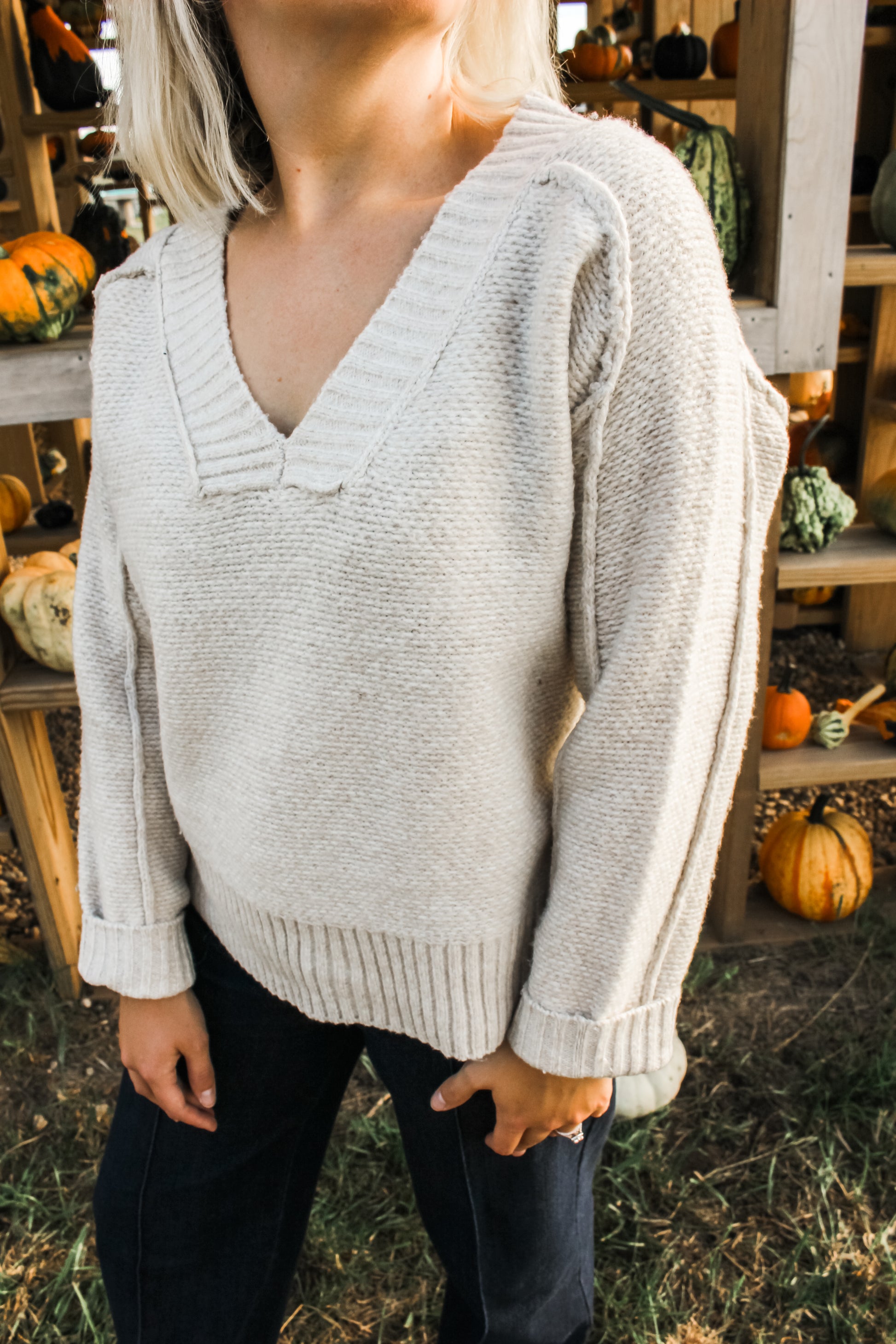 A cozy sweater to dress up or down - either way you will be cute & comfortable! Featuring a chunky knit material, v-neck, and slightly oversized fit. Fits true to size.