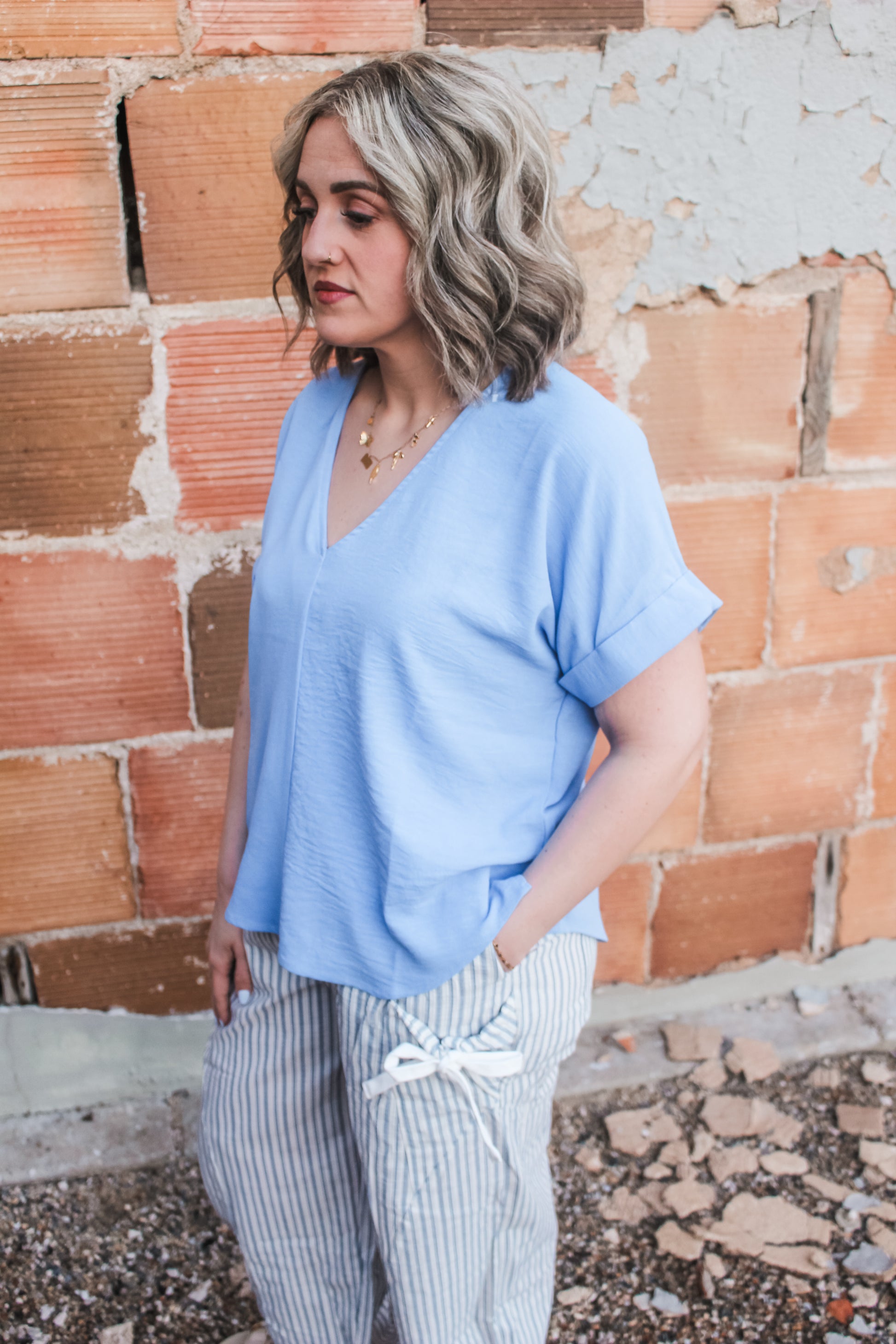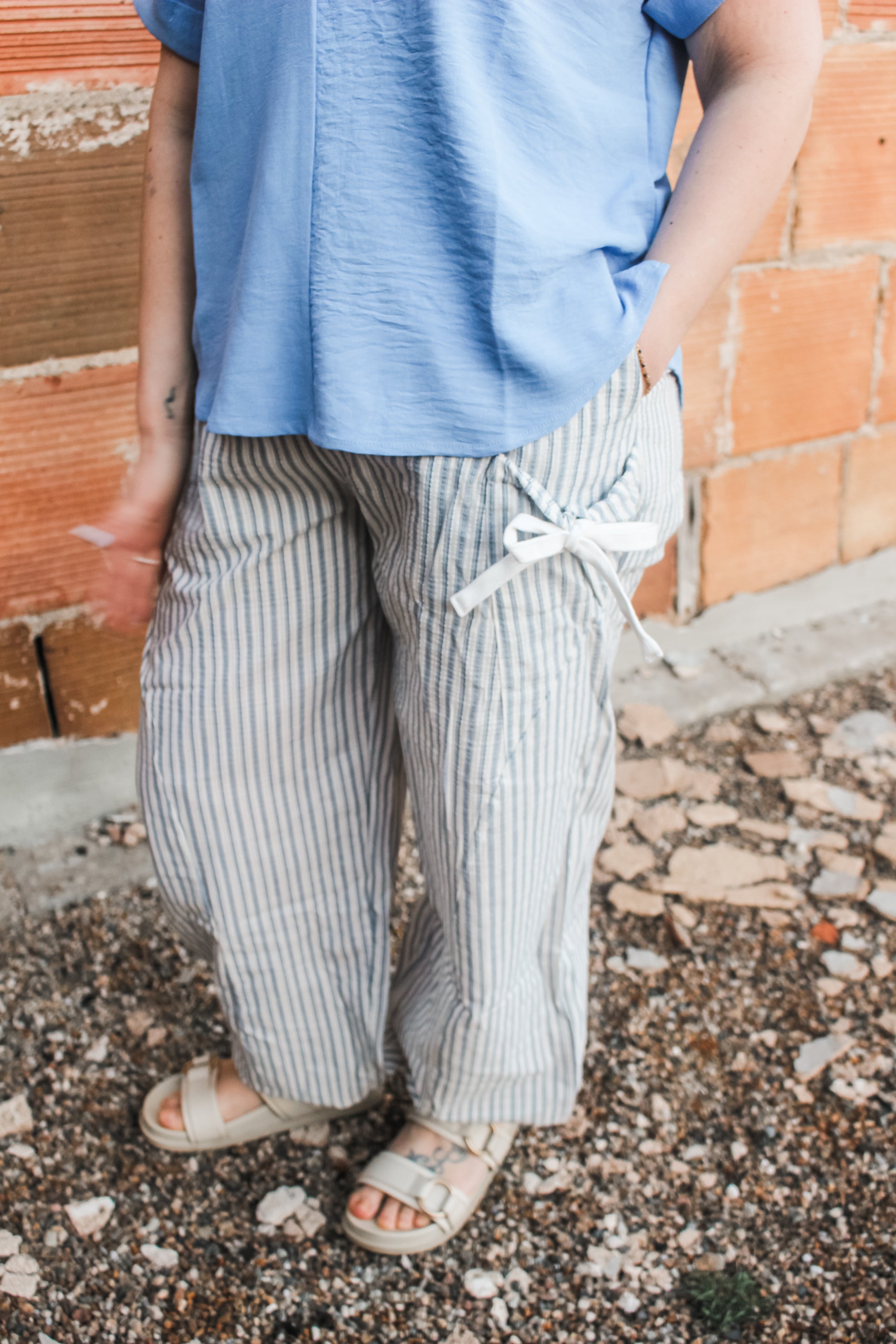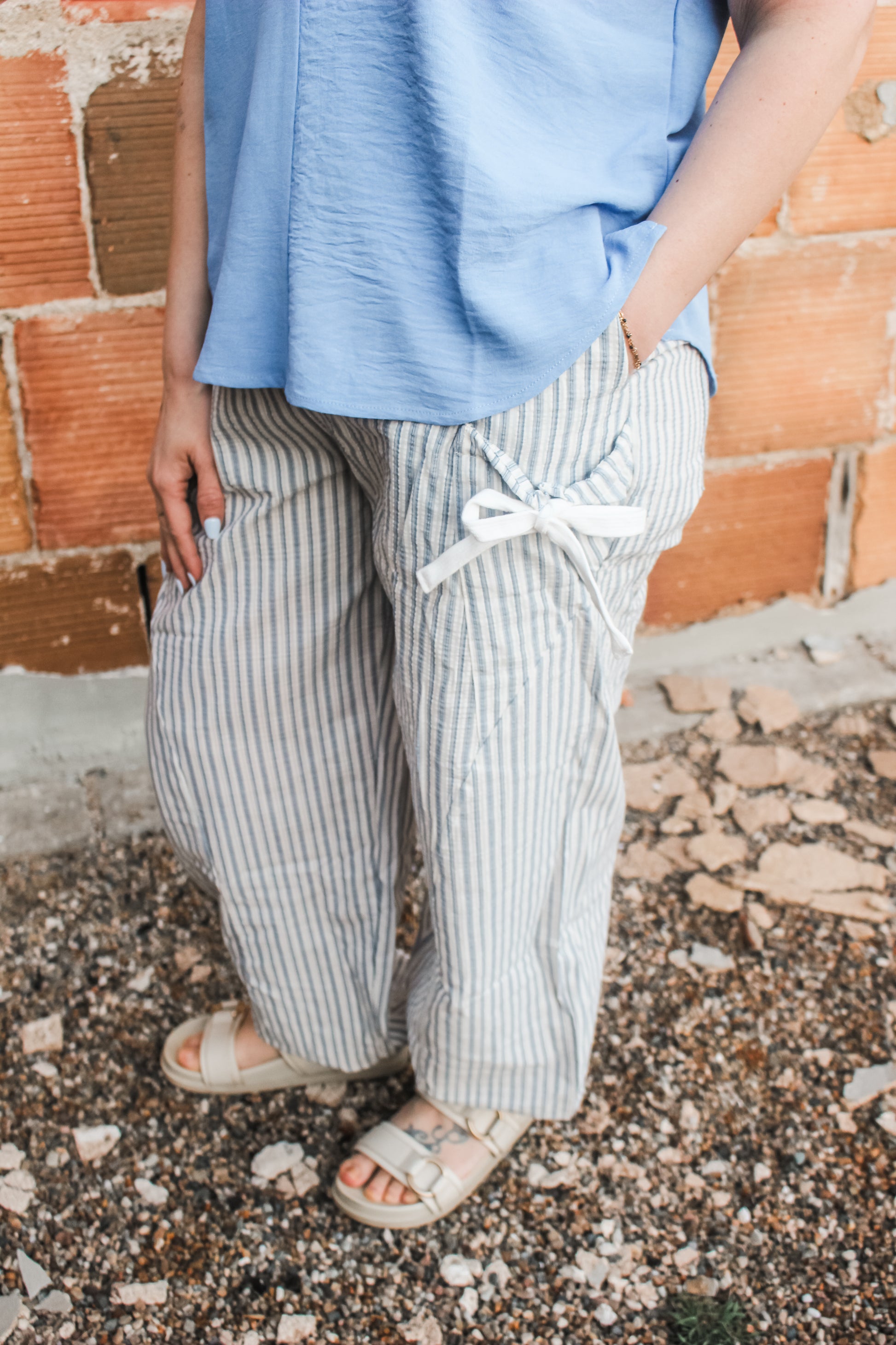 These lightweight joggers are amazing! Featuring an elastic waistband, cinched at the ankles, an adorable striped pattern, a little stretch, comfortable fit, & the cutest tied bow details on the side. Fits true to size.