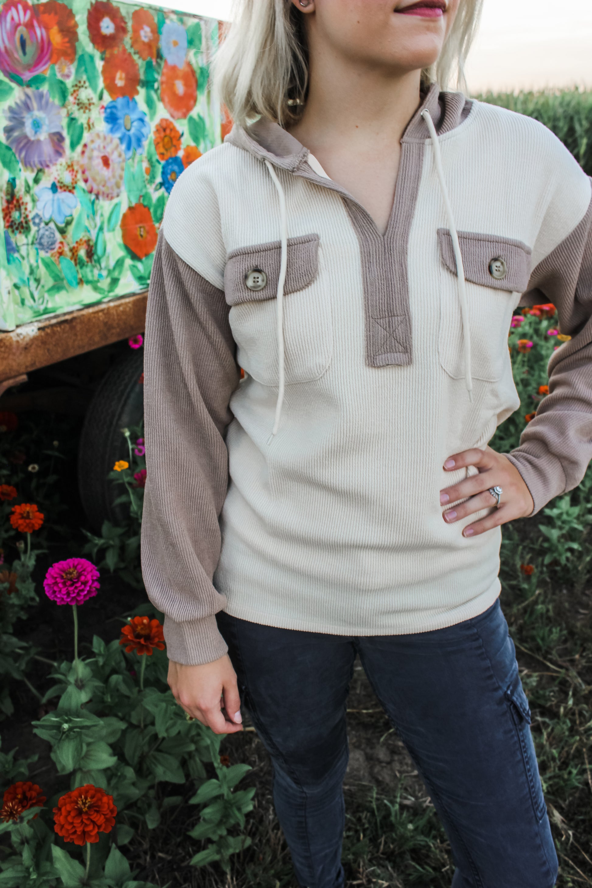 The ultimate fall hoodie - casual & cute with the perfect amount of added details! We love the ribbed material with button/pocket detail on the chest. So comfy & so cute! Featuring a hood with a v-neck, and the prettiest neutral colors. Fits true to size.