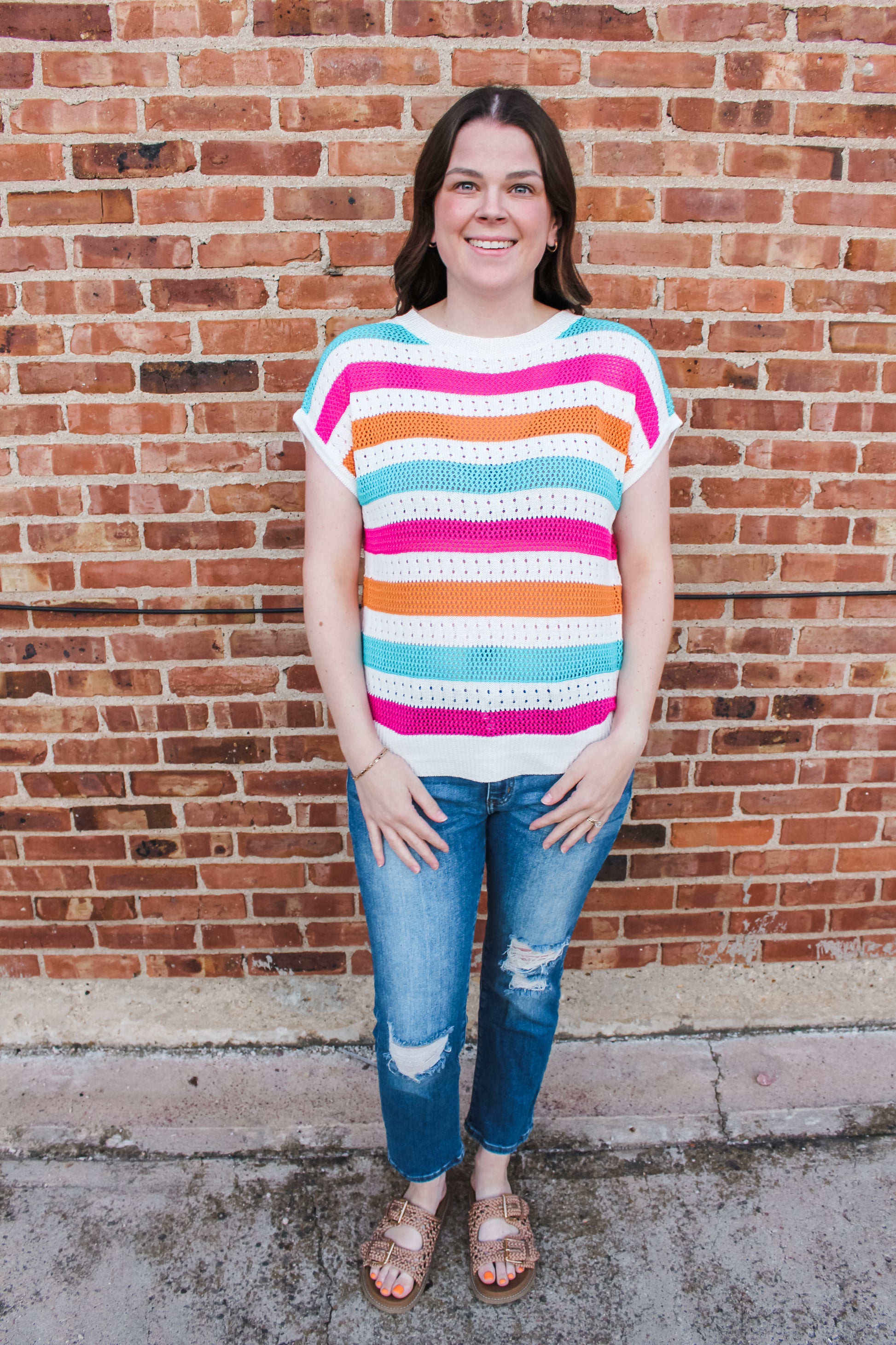 This knit sweater top is a perfect transitional piece from summer to fall - the colors are the perfect mix of summer & fall! Fit true to size.