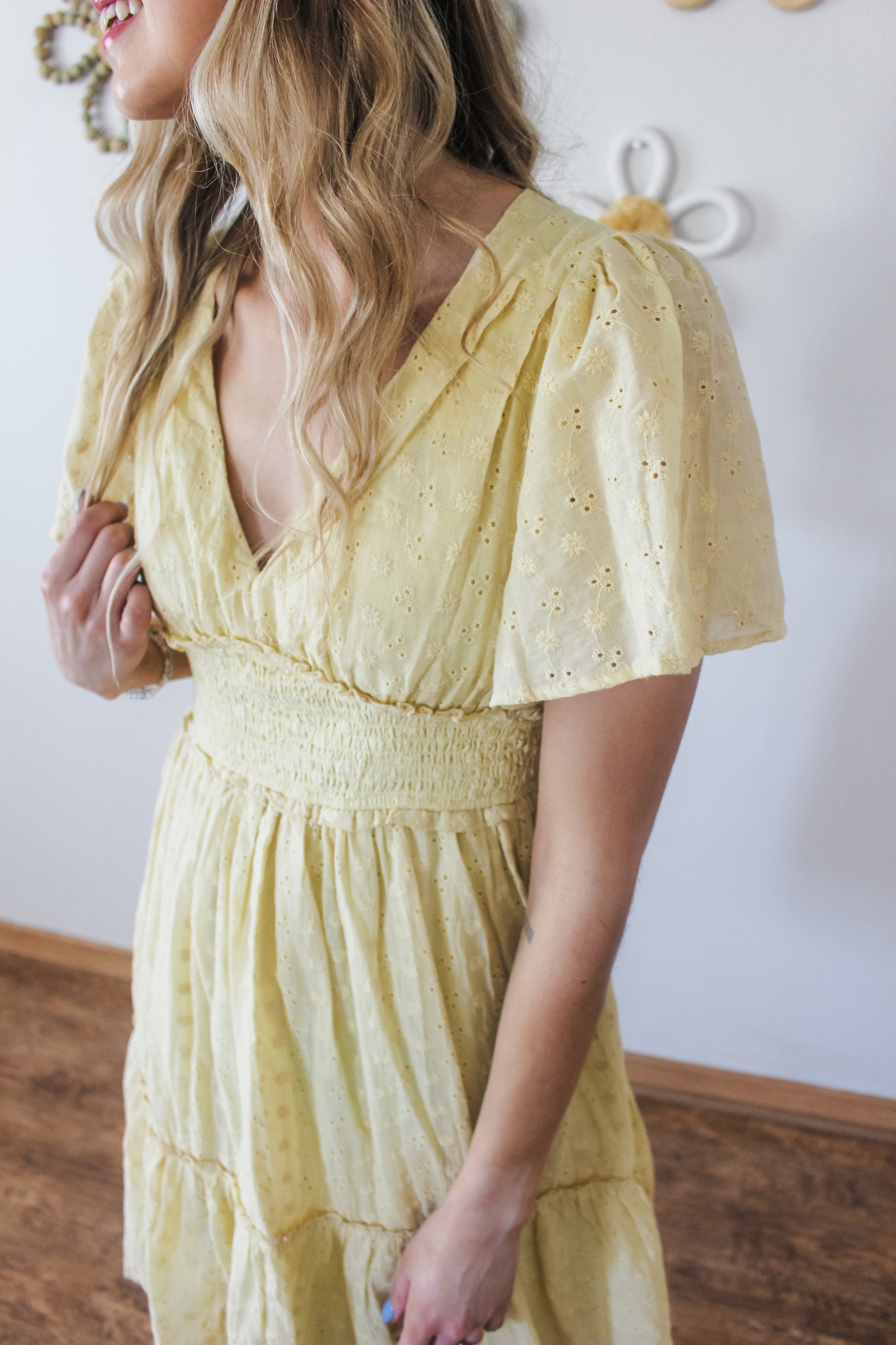 This dress is so pretty, the pictures do not do the details justice! Featuring dainty floral eyelet pattern, v-neck, rouching under the chest, keyhole closure on the back neckline, and a great length. Fits true to size.