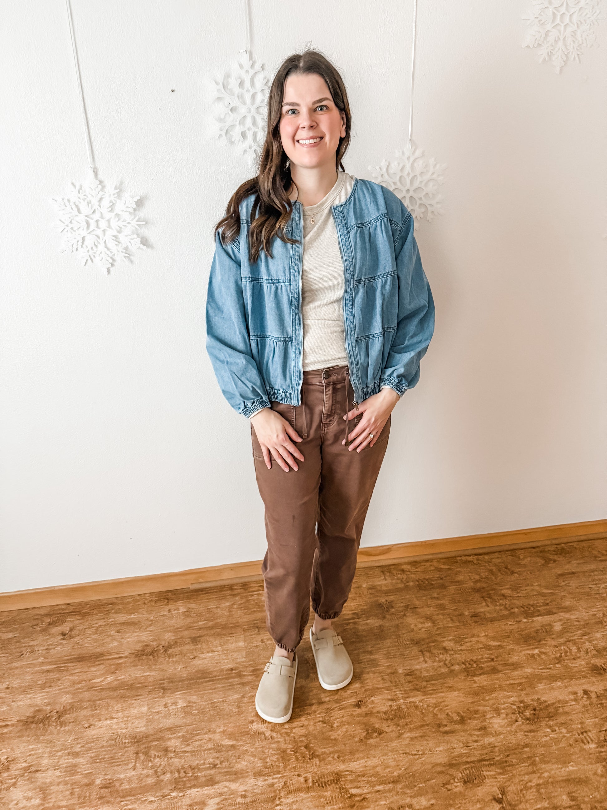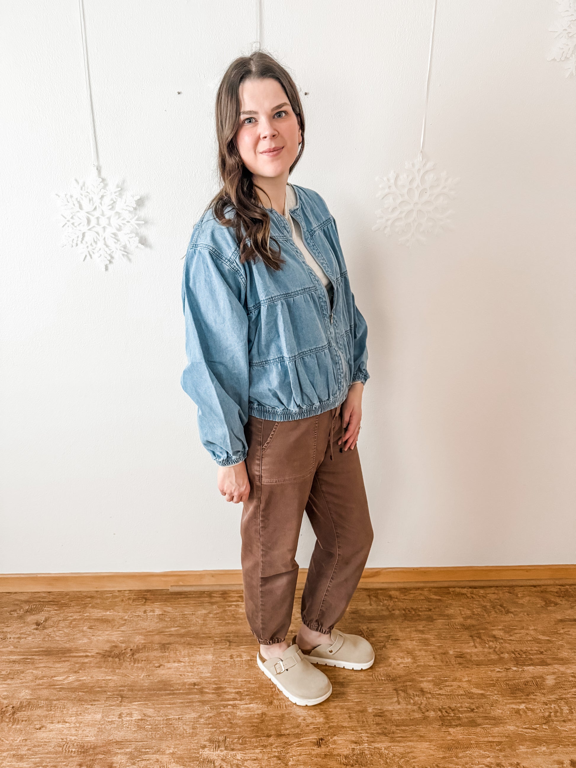 How cute is this denim jacket?! The cinched stitching detail makes it so unique & cute! Featuring a full front zip and pockets. Model is pictured wearing her true size medium layered over a lightweight long sleeve, if you plan to layer over a heavier sweater top we would recommend sizing up one.