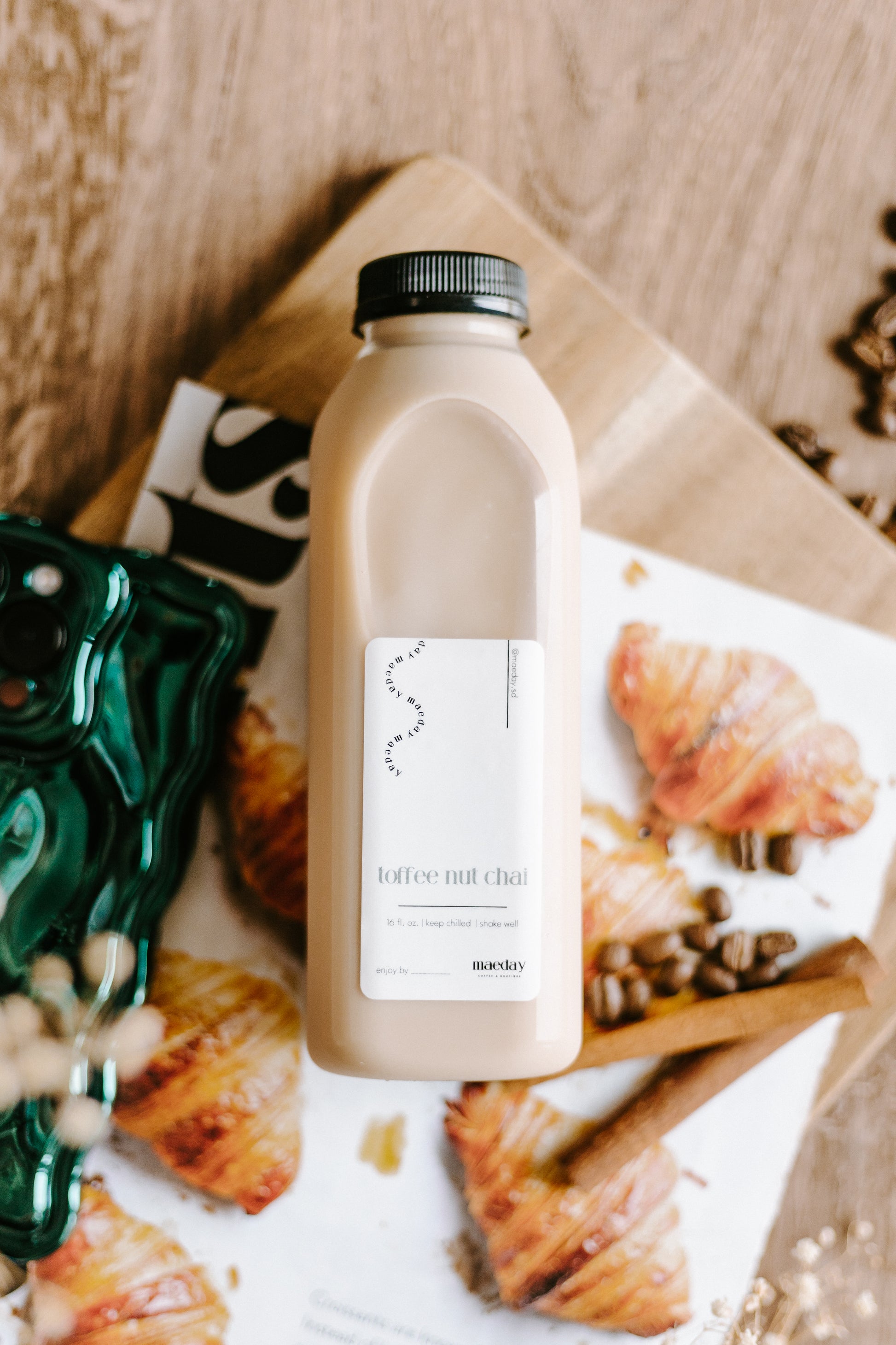 Single bottled latte, to-go, flavored with notes of toffee nut layered on chai.