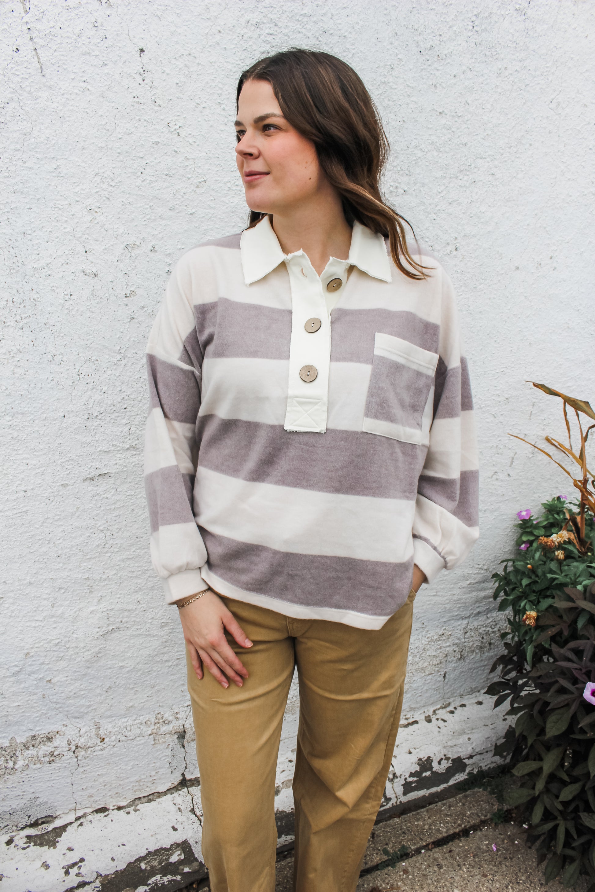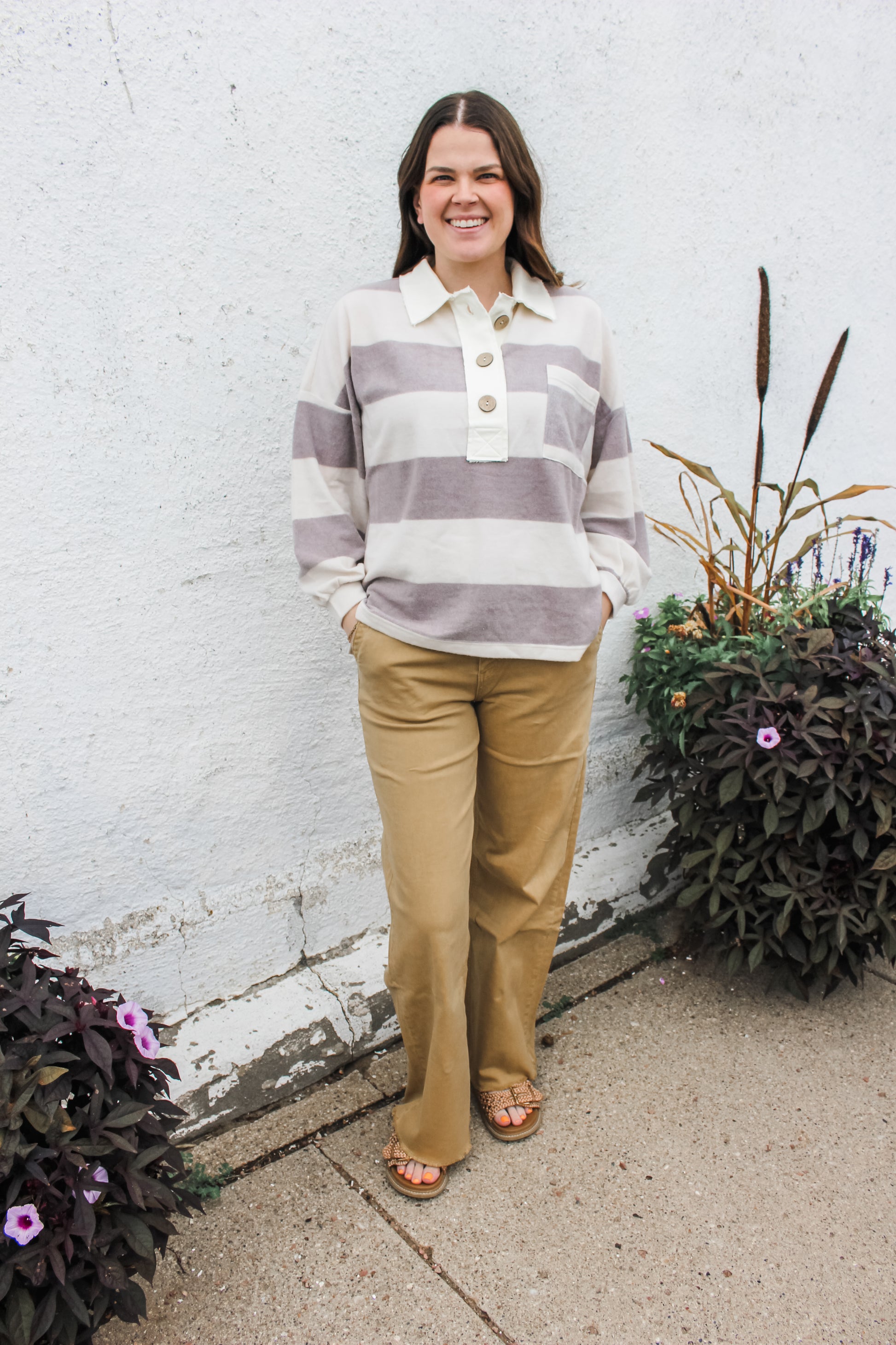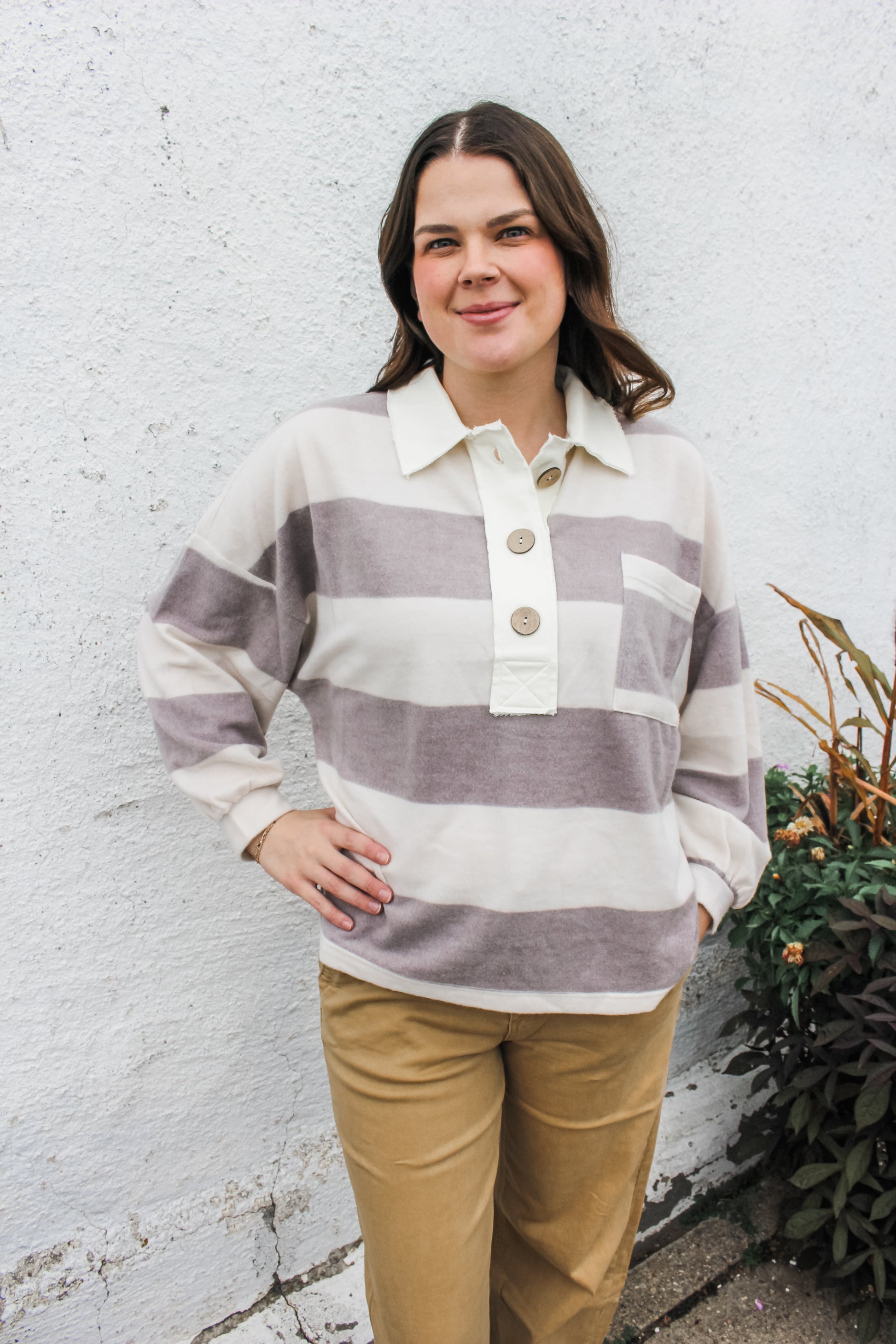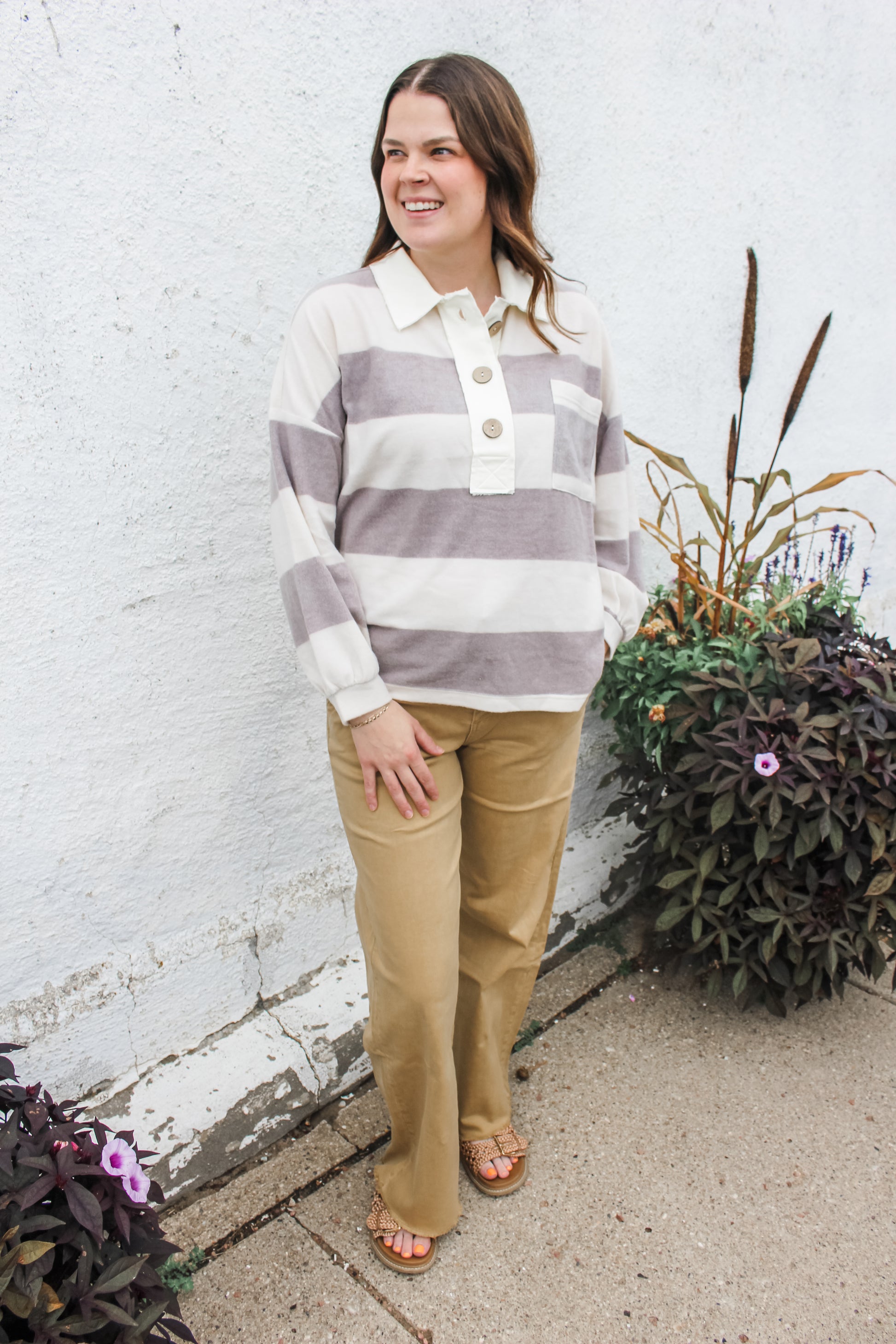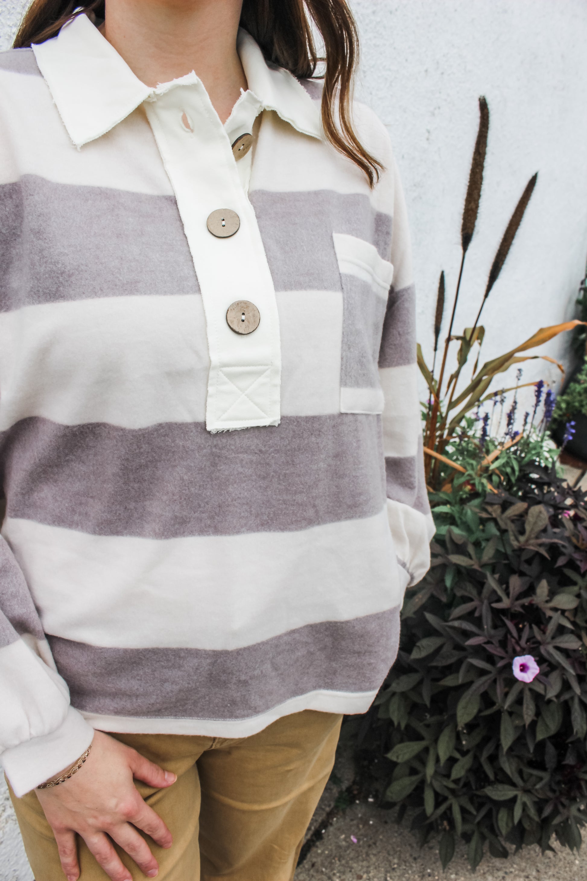 This top will be your new favorite, trust us! So soft, so comfortable, and so adorable! The strip pattern will never go out of style & the collared neckline with chunky buttons on the front are the perfect added details. We are obsessed! Fits true to size.